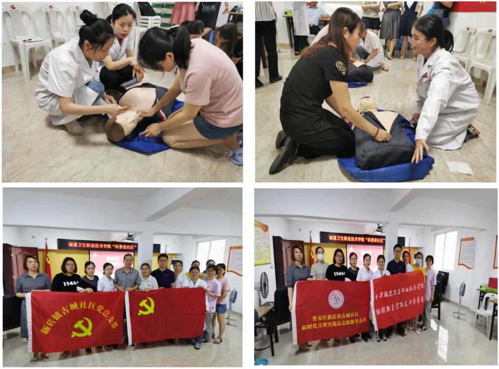 為扎實推進全民科學素質行動,弘揚科學精神,普及科學知識及醫(yī)學急救常識,2021年5月27日,福建衛(wèi)生職業(yè)技術學院繼續(xù)教育學院黨支部、醫(yī)學系第三黨支部、中醫(yī)教研室、質量管理辦公室黨支部聯(lián)合開展“科普進社區(qū)”——心肺復蘇技能培訓活動,在晉安區(qū)新店鎮(zhèn)古城社區(qū)向居民普及醫(yī)療急救知識和現(xiàn)場處置能力,提高居民應急意識、知識和技能,讓更多居民在家門口就可以學到應急救護技能。