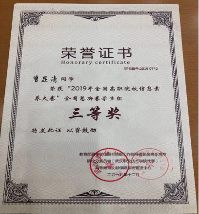 為迎接中華人民共和國(guó)成立70周年,弘揚(yáng)“不忘初心、牢記使命”、愛崗敬業(yè)、無私奉獻(xiàn)精神,12月4日,由管理系第二黨支部支委張眉芳老師及圖書館張麗萍老師指導(dǎo),第二支部入黨積極分子曾顯清同學(xué)獲得首屆全國(guó)高職院校信息素養(yǎng)大賽全國(guó)總決賽三等獎(jiǎng)。