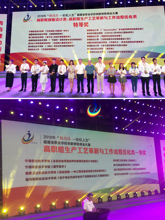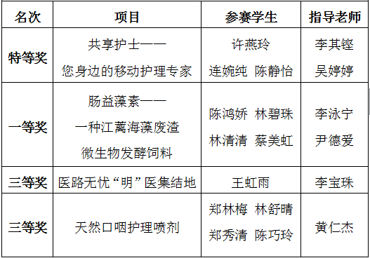 本次大賽由共青團福建省委、福建省教育廳、福建省人力資源和社會保障廳、福建省科學技術協(xié)會、福建省學生會聯(lián)合會共同舉辦,黎明職業(yè)大學、共青團泉州市委承辦。來自全省35所職業(yè)學校共計189件作品中有92件作品入圍終審決賽。我院護理系《共享護士——您身邊的移動護理專家》和藥學系《腸益藻素·一種江蘺海藻廢渣微生物發(fā)酵飼料》成功入圍決賽,經(jīng)過作品展示、陳述答辯環(huán)節(jié)的激烈角逐,最終在本屆大賽中分別榮獲特等獎和一等獎,并取得代表福建省參加國賽的資格。