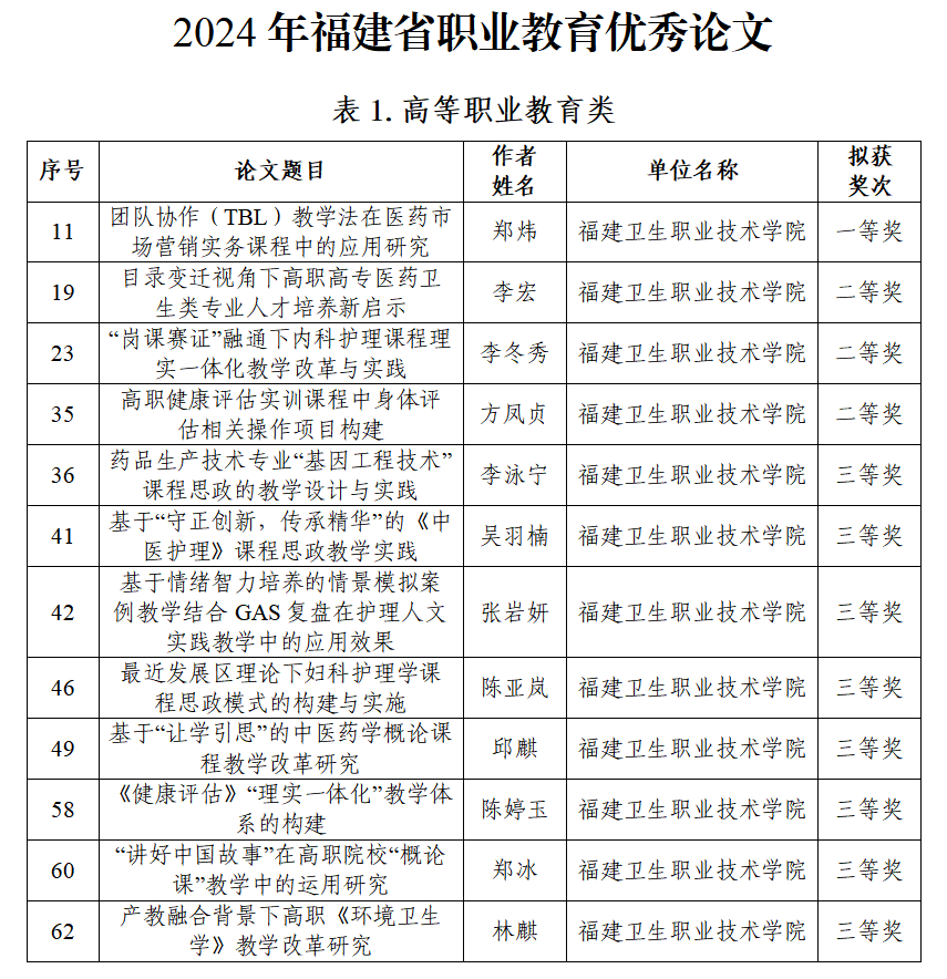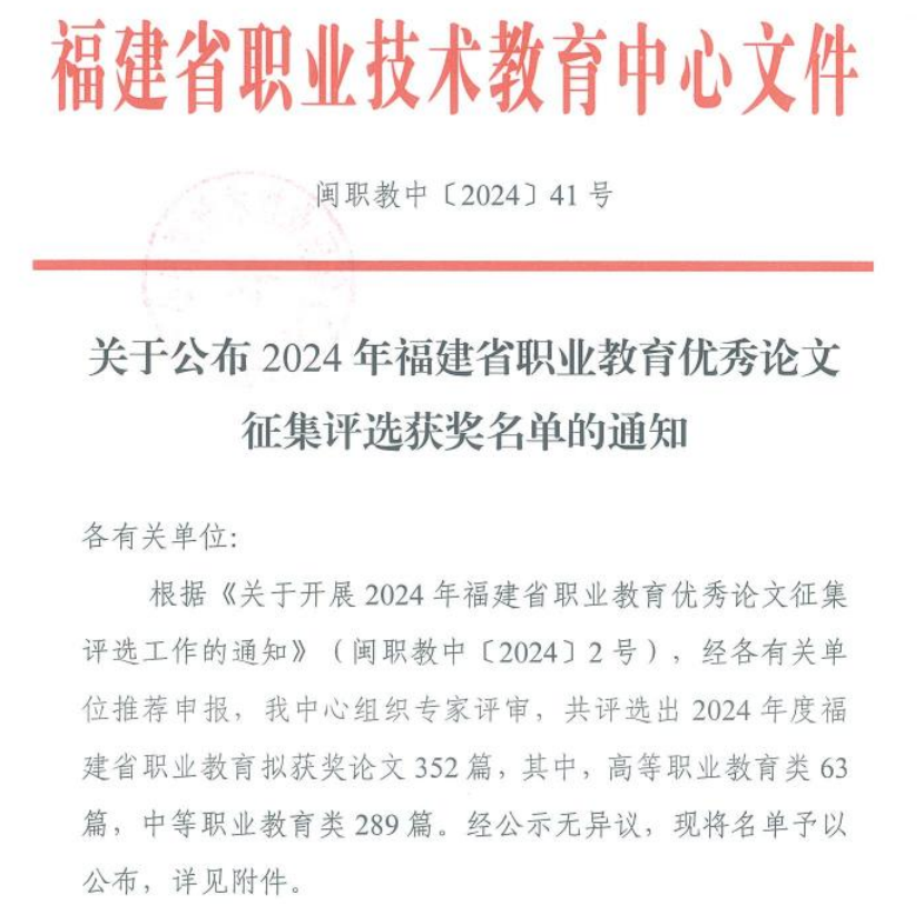 近日,在福建省職業(yè)技術教育中心組織的2024年福建省職業(yè)教育優(yōu)秀論文征集評選活動中,我校有12篇論文獲獎,其中一等獎1項、二等獎3項、三等獎8項,這是近年來獲獎數(shù)量最多的一次。自優(yōu)秀論文征集評選工作開展以來,教務處聯(lián)合各學院(部)組織開展申報評審工作,鼓勵教師及時總結教育教學改革過程中的經(jīng)驗和做法,并對選題定位、成果凝練和特色創(chuàng)新進行精細化指導。