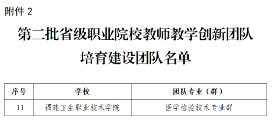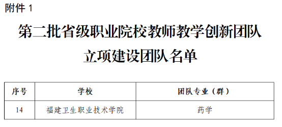 日前,福建省教育廳公布第二批省級職業(yè)院校教師教學(xué)創(chuàng)新團(tuán)隊(duì)立項(xiàng)(培育)建設(shè)團(tuán)隊(duì)名單。我校藥學(xué)專業(yè)創(chuàng)新團(tuán)隊(duì)入選第二批省級職業(yè)院校教師教學(xué)創(chuàng)新團(tuán)隊(duì)立項(xiàng)建設(shè)團(tuán)隊(duì)名單,醫(yī)學(xué)檢驗(yàn)技術(shù)專業(yè)群創(chuàng)新團(tuán)隊(duì)入選第二批省級職業(yè)院校教師教學(xué)創(chuàng)新團(tuán)隊(duì)培育建設(shè)團(tuán)隊(duì)名單。