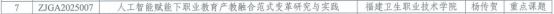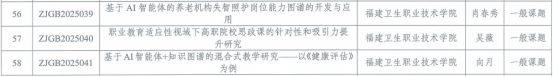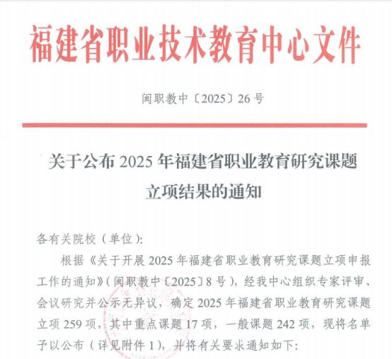 近日,福建省職業(yè)技術(shù)教育中心公布了2025年福建省職業(yè)教育研究課題立項結(jié)果,我校楊傳賀主持的《人工智能賦能下職業(yè)教育產(chǎn)教融合范式變革研究與實踐》(重點選題)、肖春秀主持的《基于AI智能體的養(yǎng)老機構(gòu)失智照護崗位能力圖譜的開發(fā)與應用》(一般課題)、吳薇主持的《職業(yè)教育適應性視域下高職院校思政課的針對性和吸引力提升研究》(一般課題)和向月主持的《基于AI智能體+知識圖譜的混合式教學研究——以<健康評估>為例》(一般課題)四項課題獲批立項。