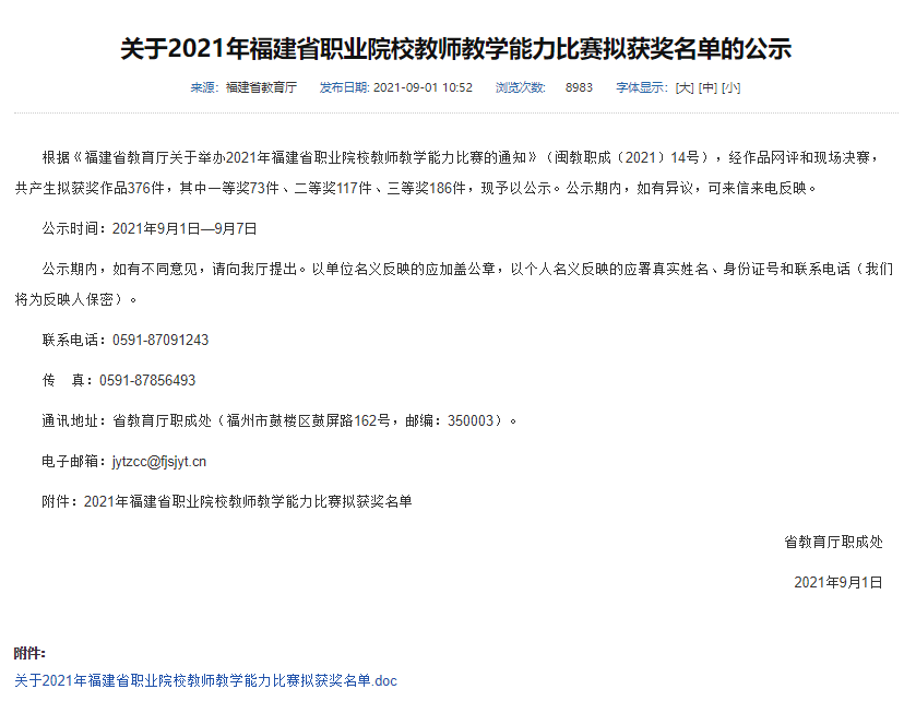 2021年福建省職業(yè)院校教師教學(xué)能力比賽我校擬獲獎名單匯總表