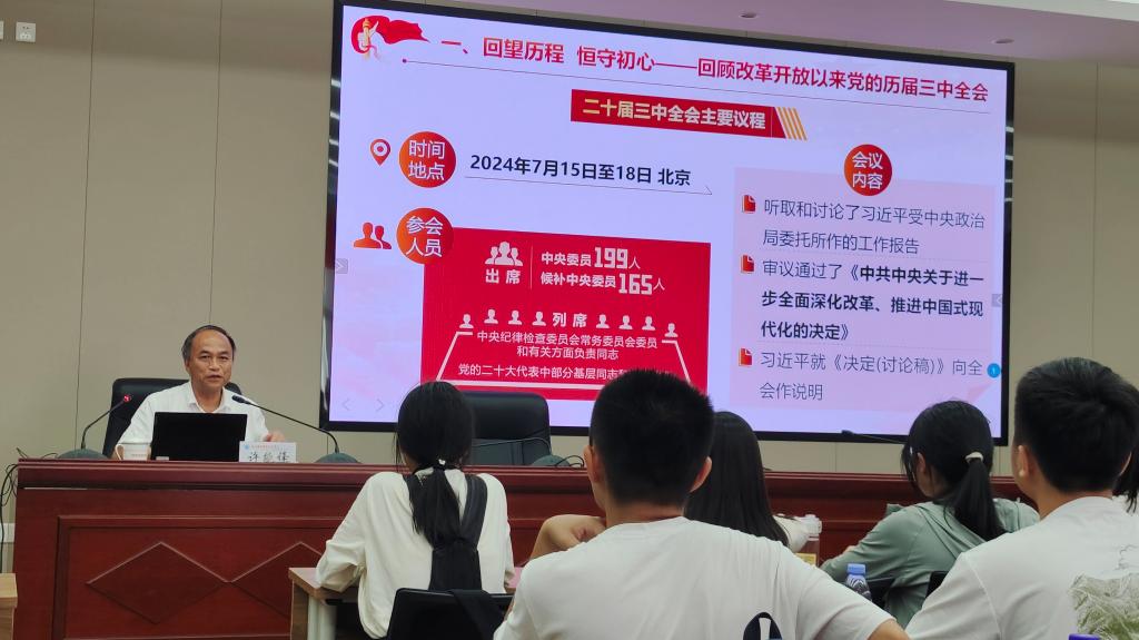 2024年9月19日,校長許能鋒在行政樓六樓會(huì)議室作題為“同心擘畫改革新藍(lán)圖 攜手奮進(jìn)強(qiáng)國新征程”開學(xué)第一課暨黨的二十屆三中全會(huì)精神宣講。