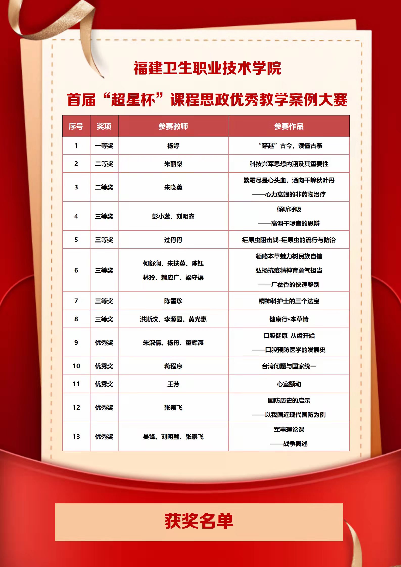 2021年9月,首屆“超星杯”全國職業(yè)院校課程思政優(yōu)秀教學(xué)案例大賽開賽,本次大賽共收到143所職業(yè)院校600多個(gè)教學(xué)團(tuán)隊(duì)的作品,設(shè)一等獎(jiǎng)6項(xiàng)、二等獎(jiǎng)16項(xiàng)、三等獎(jiǎng)30項(xiàng)、優(yōu)秀獎(jiǎng)60項(xiàng),獲獎(jiǎng)率不到19%。經(jīng)過激烈角逐,我校教學(xué)團(tuán)隊(duì)斬獲一等獎(jiǎng)1項(xiàng),二等獎(jiǎng)2項(xiàng),三等獎(jiǎng)5項(xiàng),優(yōu)秀獎(jiǎng)5項(xiàng),獲獎(jiǎng)數(shù)目占總獲獎(jiǎng)數(shù)的12%,成為本次大賽獲獎(jiǎng)數(shù)最多的學(xué)校。