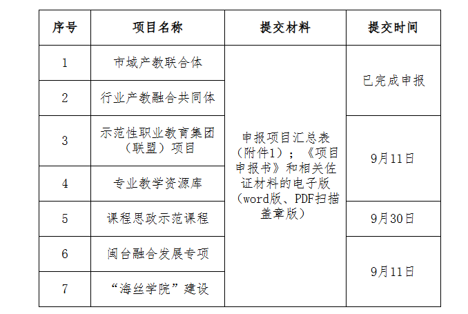 為推進(jìn)學(xué)校全面深化產(chǎn)教融合項(xiàng)目建設(shè),根據(jù)《福建省教育廳關(guān)于開展2024年省級(jí)職業(yè)教育重點(diǎn)建設(shè)項(xiàng)目申報(bào)和驗(yàn)收工作的通知》(閩教職成〔2024〕15號(hào))要求,請各學(xué)院(部)結(jié)合自身專業(yè)和項(xiàng)目建設(shè)優(yōu)勢,積極申報(bào)2024年省級(jí)職業(yè)教育重點(diǎn)建設(shè)項(xiàng)目,同時(shí)文件中要求驗(yàn)收的項(xiàng)目請相關(guān)學(xué)院(部)認(rèn)真研讀文件并做好驗(yàn)收準(zhǔn)備。