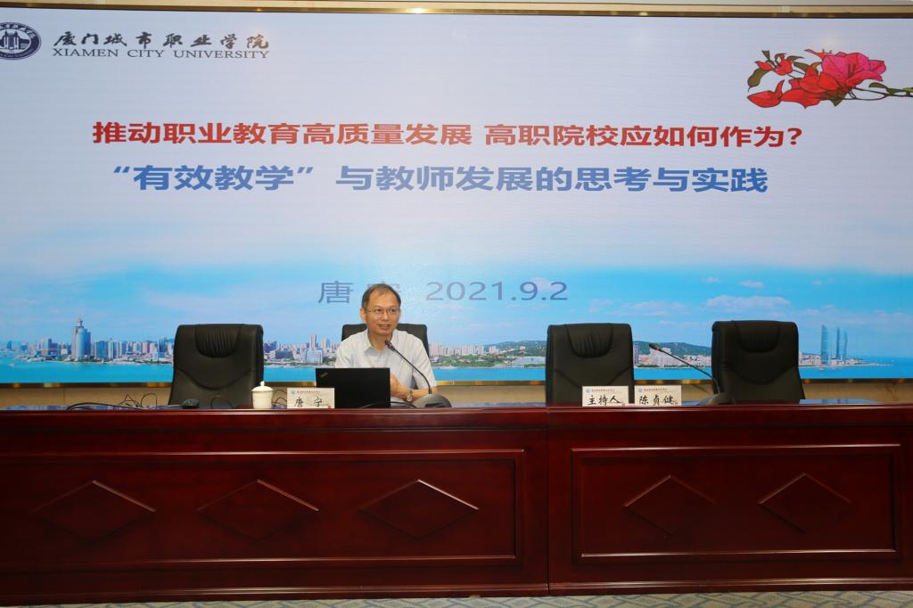 唐寧研究員以《實(shí)施有效教學(xué) 建設(shè)高水平教學(xué)團(tuán)隊(duì)》為題,以國家相關(guān)政策文件為切入點(diǎn),從參與高質(zhì)量職教體系建設(shè)、建設(shè)高水平院校和專業(yè)群、提高課程教學(xué)質(zhì)量與實(shí)效三方面分享自己的思考和體會,并介紹了廈門城市職業(yè)學(xué)院在探索實(shí)踐中的先進(jìn)經(jīng)驗(yàn)和做法。