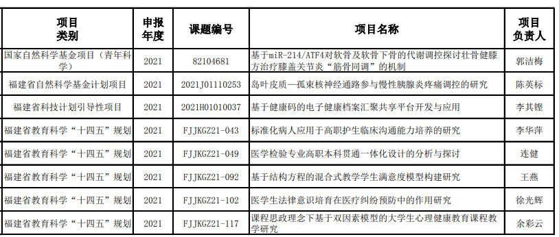 近日,我校醫(yī)學(xué)系郭潔梅老師申報(bào)的項(xiàng)目《基于miR-214/ATF4對(duì)軟骨及軟骨下骨的代謝調(diào)控探討壯骨健膝方治療膝蓋關(guān)節(jié)炎“筋骨同調(diào)”的機(jī)制》獲國(guó)家自然科學(xué)基金項(xiàng)目青年科學(xué)基金立項(xiàng),立項(xiàng)編號(hào):82104681(合作單位:福建中醫(yī)藥大學(xué))。健康管理系李其鏗老師申報(bào)的項(xiàng)目《基于健康碼的電子健康檔案匯聚共享平臺(tái)開(kāi)發(fā)與應(yīng)用》獲福建省科技計(jì)劃引導(dǎo)性項(xiàng)目立項(xiàng),立項(xiàng)編號(hào):2021H01010037;醫(yī)學(xué)基礎(chǔ)部陳英標(biāo)老師申報(bào)的項(xiàng)目《島葉皮質(zhì)—孤束核神經(jīng)通路參與慢性胰腺炎疼痛調(diào)控的研究》,立項(xiàng)編號(hào):2021J01110253。