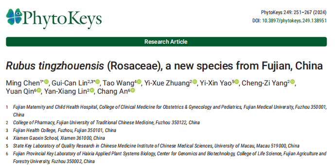 近日,國際知名植物分類學期刊《PhytoKeys》刊登我校藥學院教師林貴燦和福建農林大學博士研究生安昌等合作開展的研究成果——在野外發(fā)現的一個薔薇科懸鉤子屬新物種——紅毛木莓(Rubus tingzhouensis)。據悉,這是紅毛木莓在全球范圍內的首次報道。