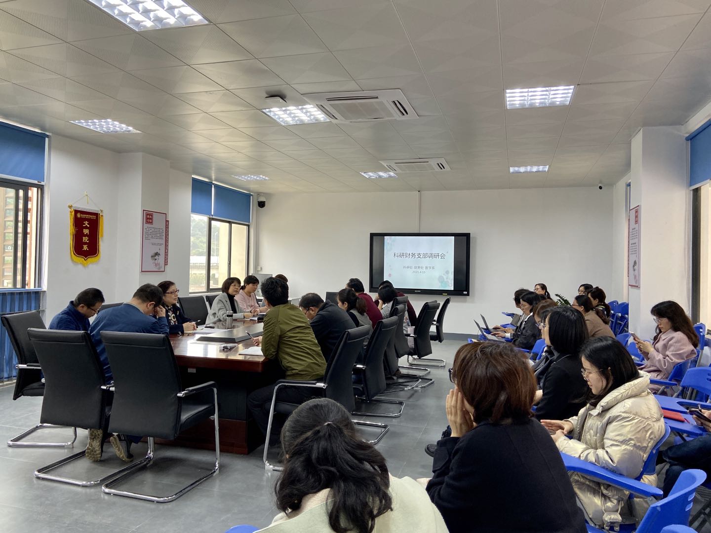 2021年4月15日,校領(lǐng)導鄭翠紅副院長率科研處、財務處黨支部黨員開展下基層調(diào)研活動。醫(yī)學系、護理學院、健康管理系、醫(yī)學基礎部主要領(lǐng)導及教師代表參加此次調(diào)研。本次調(diào)研采取集中調(diào)研方式,在醫(yī)學系會議室舉行。