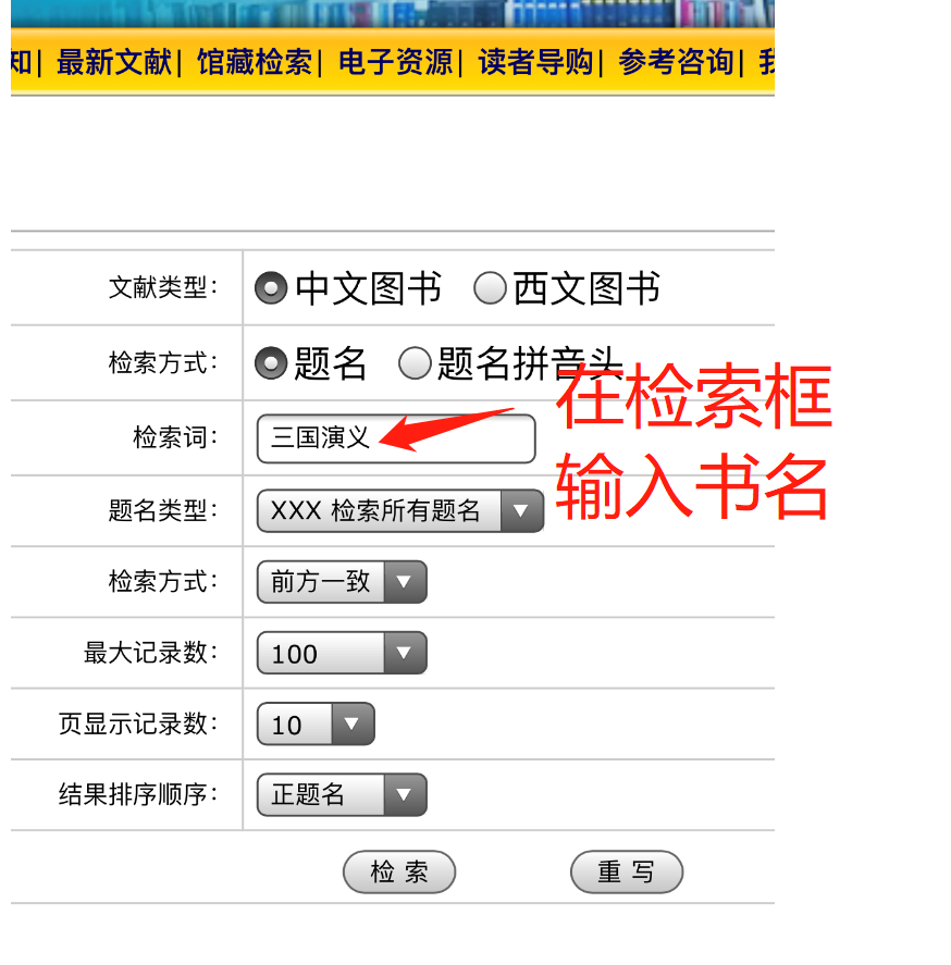 以下兩種途徑均可進(jìn)入圖書館檢索頁面,檢索步驟同“校外檢索”。