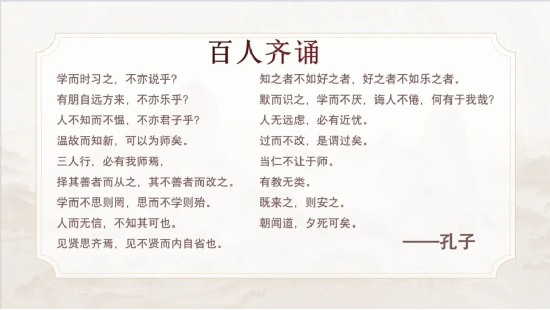 活動(dòng)接近尾聲,由主持人領(lǐng)讀《論語》中的原著金句,并現(xiàn)場(chǎng)教學(xué)劇中出現(xiàn)的禮儀手勢(shì)——“叉手禮”,讓同學(xué)們體會(huì)到傳統(tǒng)文化的魅力,也更加加深了對(duì)孔子這位“至圣先師”的理解。