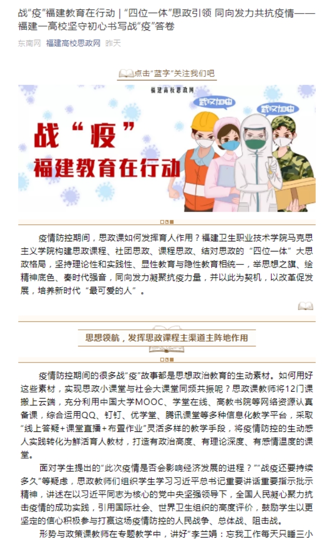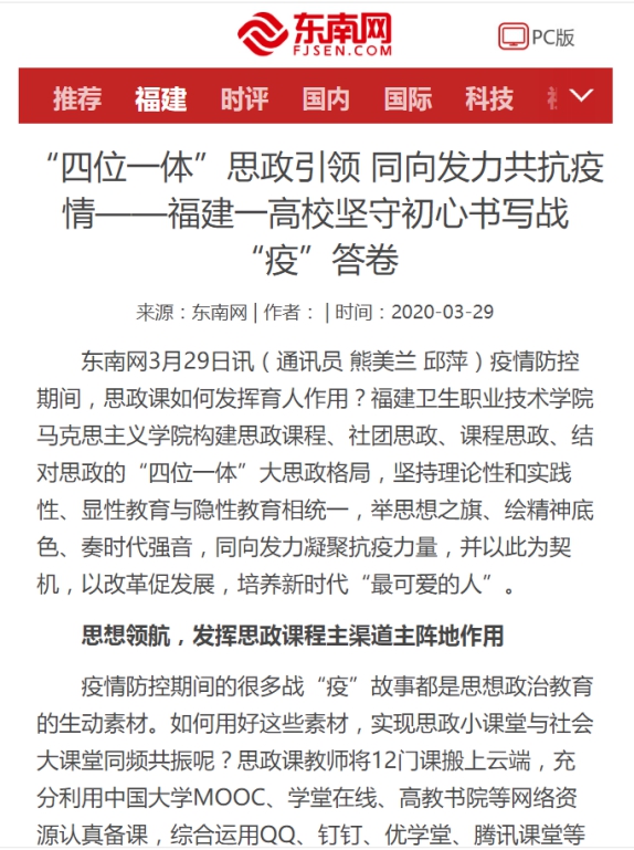 《東南網(wǎng)》3月29日以《四位一體”思政引領(lǐng) 同向發(fā)力共抗疫情——福建一高校堅(jiān)守初心書寫戰(zhàn)“疫”答卷》對馬克思主義學(xué)院進(jìn)行了報(bào)道。