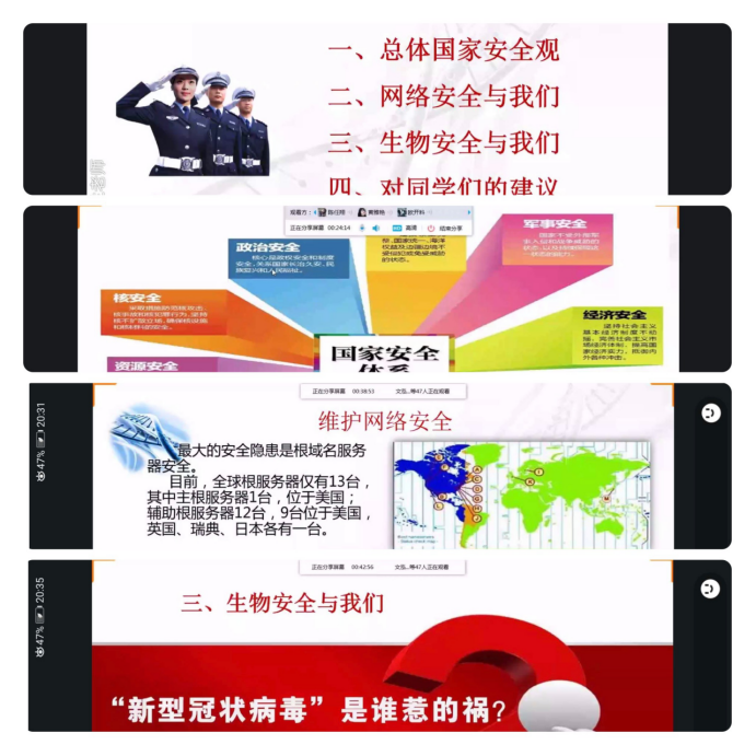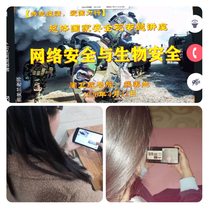 家是最小國,國是千萬家,有了強(qiáng)的國才有富的家,一個(gè)具有強(qiáng)大凝聚力的國家是無數(shù)幸福小家的堅(jiān)強(qiáng)可靠保障。今年4月15日是我國第5個(gè)全民國家安全教育日,活動(dòng)主題是“堅(jiān)持總體國家安全觀,統(tǒng)籌傳統(tǒng)安全和非傳統(tǒng)安全,為決勝全面建成小康社會(huì)提供堅(jiān)強(qiáng)保障”。正所謂家國安危人人有責(zé),值此新冠肺炎疫情防控關(guān)鍵時(shí)期,為了使同學(xué)們更加深入認(rèn)識(shí)總體國家安全觀,于4月12日晚8點(diǎn),馬院熊美蘭老師通過QQ群線上平臺(tái),為結(jié)對(duì)班19級(jí)檢驗(yàn)302班同學(xué)開設(shè)題為《網(wǎng)絡(luò)安全與生物安全》的總體國家安全觀專題講座。講座由輔導(dǎo)員龍梅梅主持,時(shí)長一個(gè)半小時(shí)。
