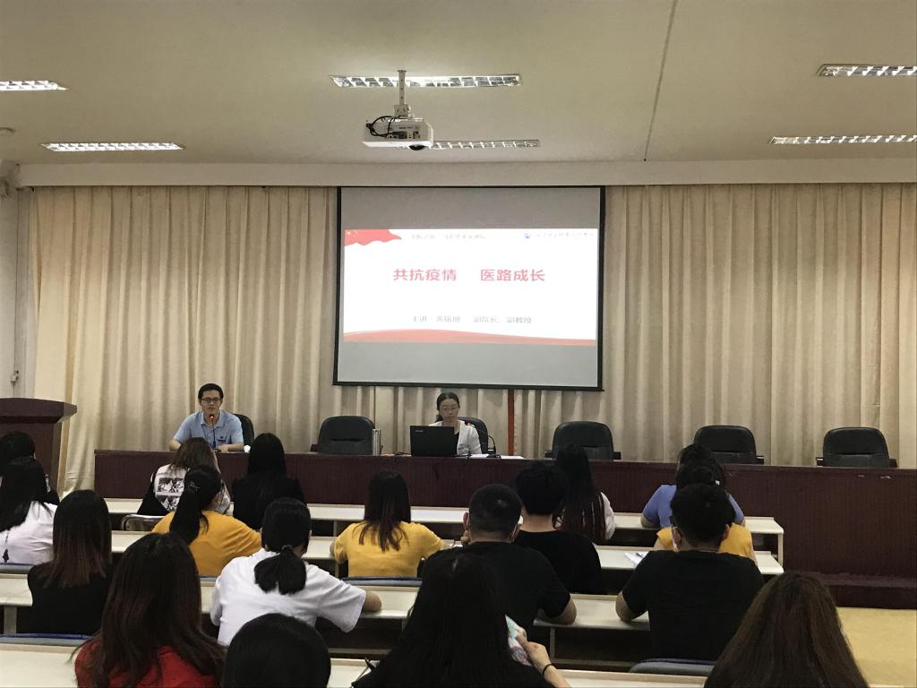 2020年6月11日、6月18日、7月2日我院黨委書記曾武祈、黨委副書記李美華、紀(jì)委書記游鋒、副校長陳貞健、副校長黃銘珊、副校長鄭翠紅等校領(lǐng)導(dǎo)以“共抗疫情,醫(yī)路成長——奮斗成就新時代”為主題紛紛走上講臺,分別為陸續(xù)返校的大二學(xué)生,精彩奉獻(xiàn)返校思政戰(zhàn)“疫”課,將新冠肺炎疫情防控生動感人的實踐轉(zhuǎn)化為鮮活有力的思政育人元素,引導(dǎo)衛(wèi)院學(xué)子以青春奮斗擔(dān)當(dāng)精神,堅定理想信念,站穩(wěn)人民立場,練就過硬本領(lǐng),投身強國偉業(yè)。各系等返校學(xué)生,黨政領(lǐng)導(dǎo)干部、思政課教師和輔導(dǎo)員也齊聚課堂聆聽,未返校的學(xué)生也通過釘釘課堂、騰訊會議等網(wǎng)上平臺在線觀看學(xué)習(xí),開展線上交流和討論。
