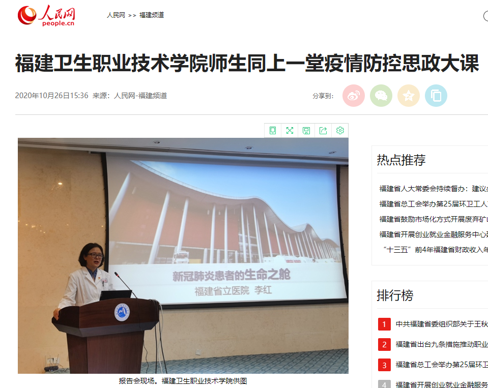 2020年特別針對偉大抗疫精神融入專題化教學上不斷突破,緊扣新冠肺炎疫情防控重點工作,組織全校師生同上全國高校“疫情防控思政大課”,打造《解碼戰(zhàn)勝疫情背后的中華優(yōu)秀傳統(tǒng)文化》等6堂思政課戰(zhàn)疫小課堂,編寫50個“抗疫”思政案例?!赌拇蜈A疫情防控阻擊戰(zhàn),聚力培育戰(zhàn)“疫”思想疫苗》、《福建衛(wèi)生職業(yè)技術學院開講疫情防控思政第一課》、《疫情大考告訴我們什么?——疫情防控思政大課引閩衛(wèi)院熱議》等報道,獲得人民網(wǎng)、東南網(wǎng)、福建省教育廳、福建高校思政網(wǎng)、全國高職高專院校思政課建設聯(lián)盟網(wǎng)等主媒宣傳。