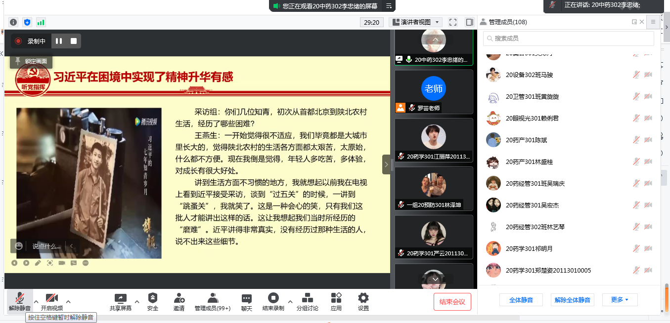 如何扣好人生的第一??圩??圍繞著這個主題,3月28日晚,校青馬班全體學員、習近平新時代中國特色社會主義思想讀書社原夢隊全體隊員線上齊聚,以接力分享的形式,共品《習近平的七年知青歲月》。活動邀請馬克思主義學院羅蕓老師擔任嘉賓。