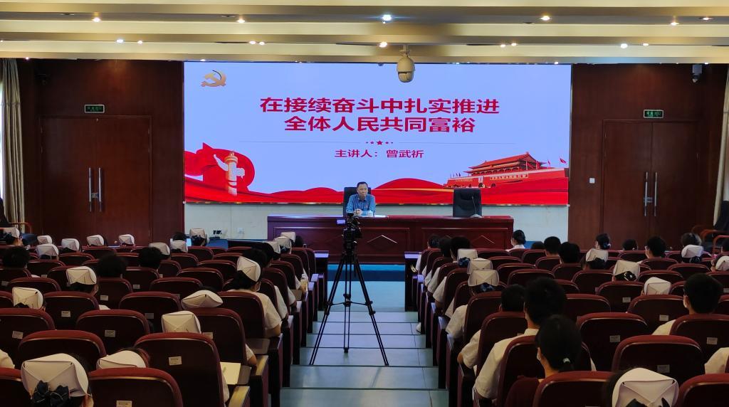 黨委書記曾武祈以“在接續(xù)奮斗中扎實(shí)推進(jìn)共同富?!睘轭},講述“時(shí)代三大件”“閩寧山海情”“三進(jìn)下黨鄉(xiāng)”等一個(gè)個(gè)難忘的脫貧故事,詳細(xì)介紹習(xí)近平總書記在福建任職期間,推動(dòng)對(duì)口幫扶、促進(jìn)共同富裕重大工程及相關(guān)論述,透徹分析了共同富裕的科學(xué)內(nèi)涵、實(shí)踐途徑及未來征程。談到學(xué)校中職護(hù)理專業(yè)精準(zhǔn)技術(shù)扶貧委培班時(shí),曾武祈向在場(chǎng)同學(xué)贈(zèng)送《教育點(diǎn)燃希望》一書。他指出,學(xué)校始終與黨和國家同頻共振,堅(jiān)定不移地在共同富裕背景下推動(dòng)學(xué)校的高質(zhì)量發(fā)展,將凝聚青年力量作為立德樹人工作的重中之重。他號(hào)召閩衛(wèi)學(xué)子們潛精研思,做共同富裕思想的堅(jiān)定學(xué)習(xí)者;矢志奮斗,做共同富裕的忠實(shí)踐行者。