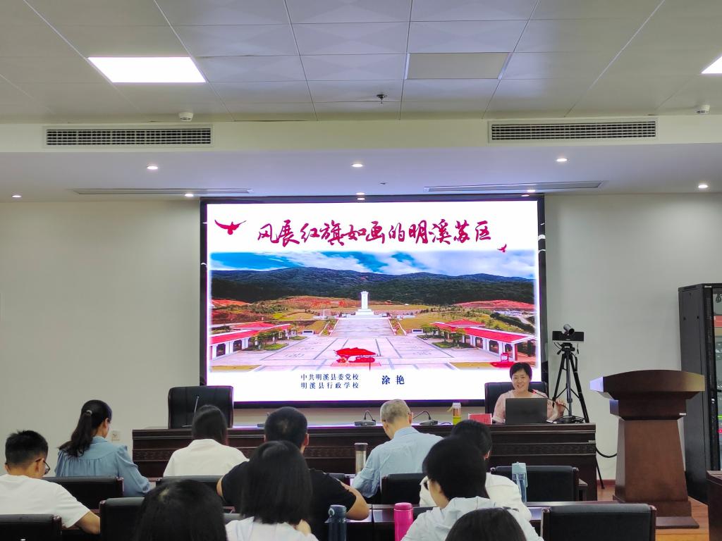 “寧化、清流、歸化,路隘林深苔滑。今日向何方,直指武夷山下。山下山下,風(fēng)展紅旗如畫?!币皇酌珴蓶|同志的《如夢(mèng)令·元旦》讓教師們重回革命戰(zhàn)爭(zhēng)年代如火如荼的斗爭(zhēng)場(chǎng)景,重溫革命先烈用鮮血和生命鑄就的蘇區(qū)精神。在理論教學(xué)環(huán)節(jié)中,明溪縣委黨校高級(jí)講師涂艷為教師作《風(fēng)展紅旗如畫的明溪蘇區(qū)》專題講座。她從“路隘林深苔滑——血與火的革命實(shí)踐”“風(fēng)展紅旗如畫——譜寫時(shí)代的新篇章”兩部分為教師們上了一堂生動(dòng)的黨史思政課。