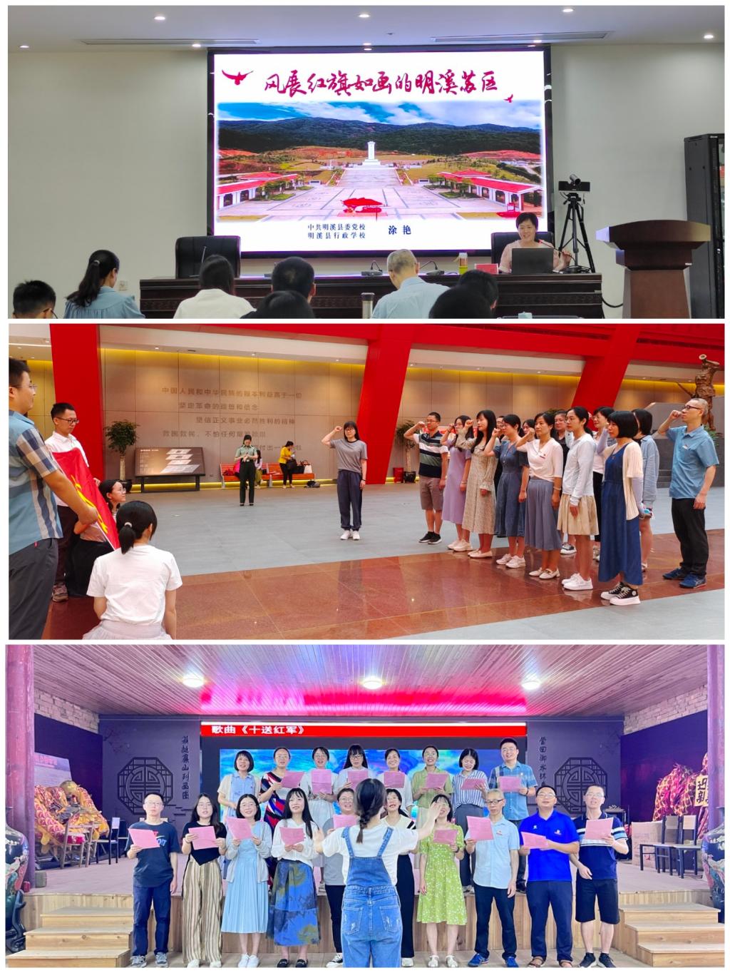 “寧化、清流、歸化,路隘林深苔滑。今日向何方,直指武夷山下。山下山下,風(fēng)展紅旗如畫?!币皇酌珴蓶|同志的《如夢令·元旦》讓馬院教師重回革命戰(zhàn)爭年代如火如荼的斗爭場景,重溫革命先烈用鮮血和生命鑄就的蘇區(qū)精神。在理論教學(xué)環(huán)節(jié)中,明溪縣委黨校高級講師涂艷為馬院教師作《風(fēng)展紅旗如畫的明溪蘇區(qū)》專題講座。她從“路隘林深苔滑——血與火的革命實踐”“風(fēng)展紅旗如畫——譜寫時代的新篇章”等兩部分為教師們上了一堂生動的黨史思政課?!帮嬎荚?,決不能忘了老區(qū)蘇區(qū)人民。”為銘記習(xí)近平總書記的囑托,深化黨史學(xué)習(xí)成效,馬院教師前往寧化縣長征出發(fā)紀(jì)念館、明溪縣革命紀(jì)念園、夏陽鄉(xiāng)“中央紅軍村”御簾村、曹坊中央紅軍長征集結(jié)出發(fā)地、滴水巖紅軍戰(zhàn)地醫(yī)院舊址等歷史遺跡和愛國主義教育基地開展現(xiàn)場教學(xué)。在教學(xué)現(xiàn)場,馬院教師們聆聽著邱門雙烈士、賴水金英雄、銅鐵嶺戰(zhàn)斗、戰(zhàn)地醫(yī)院等一個個感人至深的故事,銘記長征精神、蘇區(qū)精神,堅定革命理想高于天,讓傳承紅色基因、理想信念之光照亮鑄魂育人之路。在長征出發(fā)紀(jì)念館,全體思政課黨員教師重溫入黨誓詞,點(diǎn)燃了思政人干事創(chuàng)業(yè)、講好中國故事的激情。