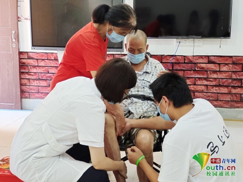 圖上為馬上逐夢隊隊員配合義診專家進行肢體的被動活動和四肢牽伸,并細致提供康復保健的建議。中國青年網(wǎng)通訊員 邱煒靖 供圖?