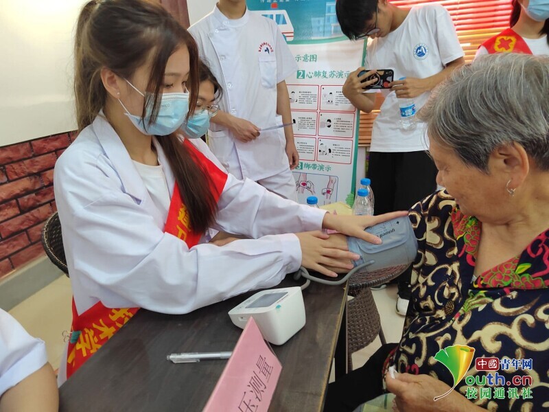 圖為馬上逐夢隊隊員為老人測血壓。中國青年網(wǎng)通訊員 邱煒靖 供圖?