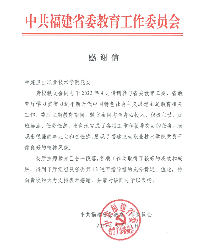 近日,我校收到中共福建省委教育工委的感謝信,對我校賴文金同志借調(diào)參與省委教育工委、省教育廳學習貫徹習近平新時代中國特色社會主義思想主題教育期間相關工作表示感謝。
