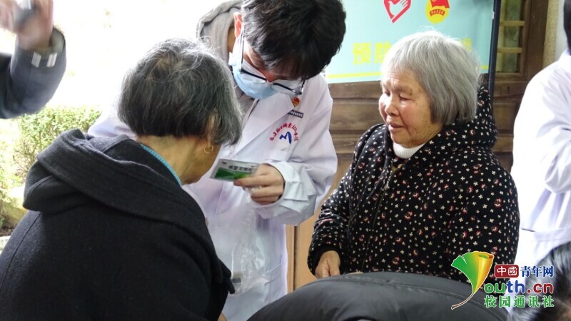 圖為“醫(yī)脈相承隊(duì)”隊(duì)員為村民分發(fā)感冒藥,并告知其注意事項(xiàng)。中國(guó)青年網(wǎng)通訊員 陳惜如 供圖