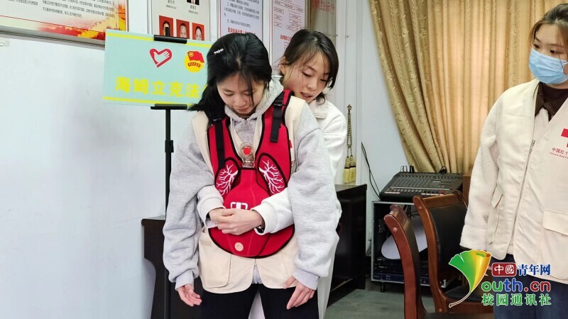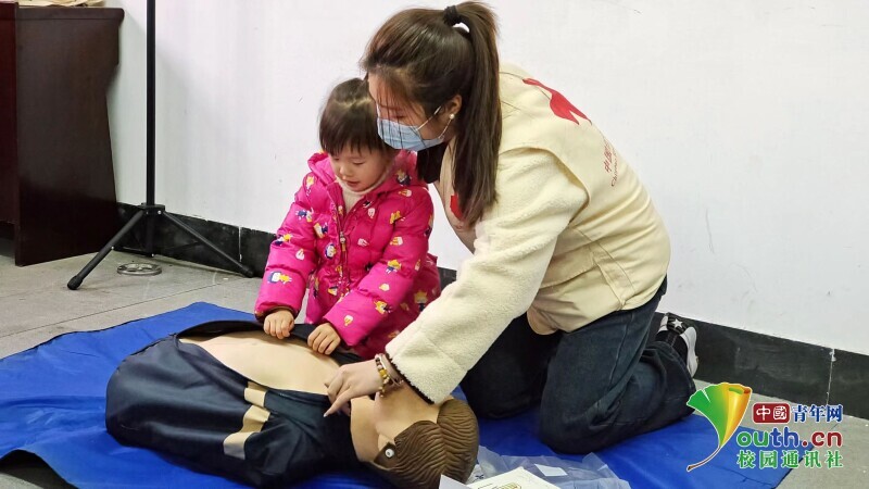 圖為“醫(yī)脈相承隊(duì)”隊(duì)員為小朋友進(jìn)行CPR教學(xué)。中國(guó)青年網(wǎng)通訊員 陳惜如 供圖