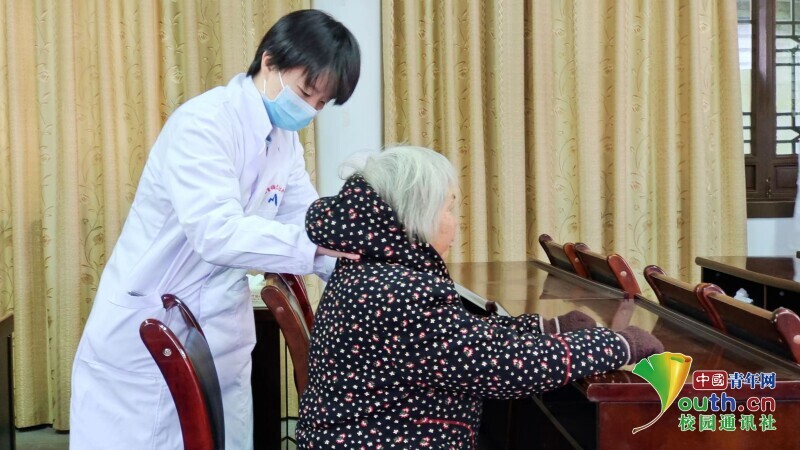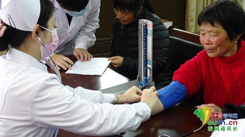 圖為“醫(yī)脈相承隊(duì)”隊(duì)員為村民進(jìn)行測(cè)量血壓。中國(guó)青年網(wǎng)通訊員 陳惜如 供圖