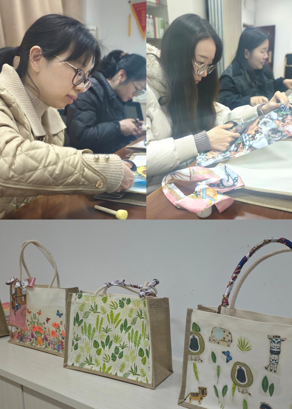 活動現(xiàn)場氣氛熱烈,歡聲笑語不斷,大家紛紛拿起畫筆、剪刀和膠水,將五彩斑斕的圖案精心地拼貼在帆布包上,創(chuàng)作出獨一無二的藝術作品。