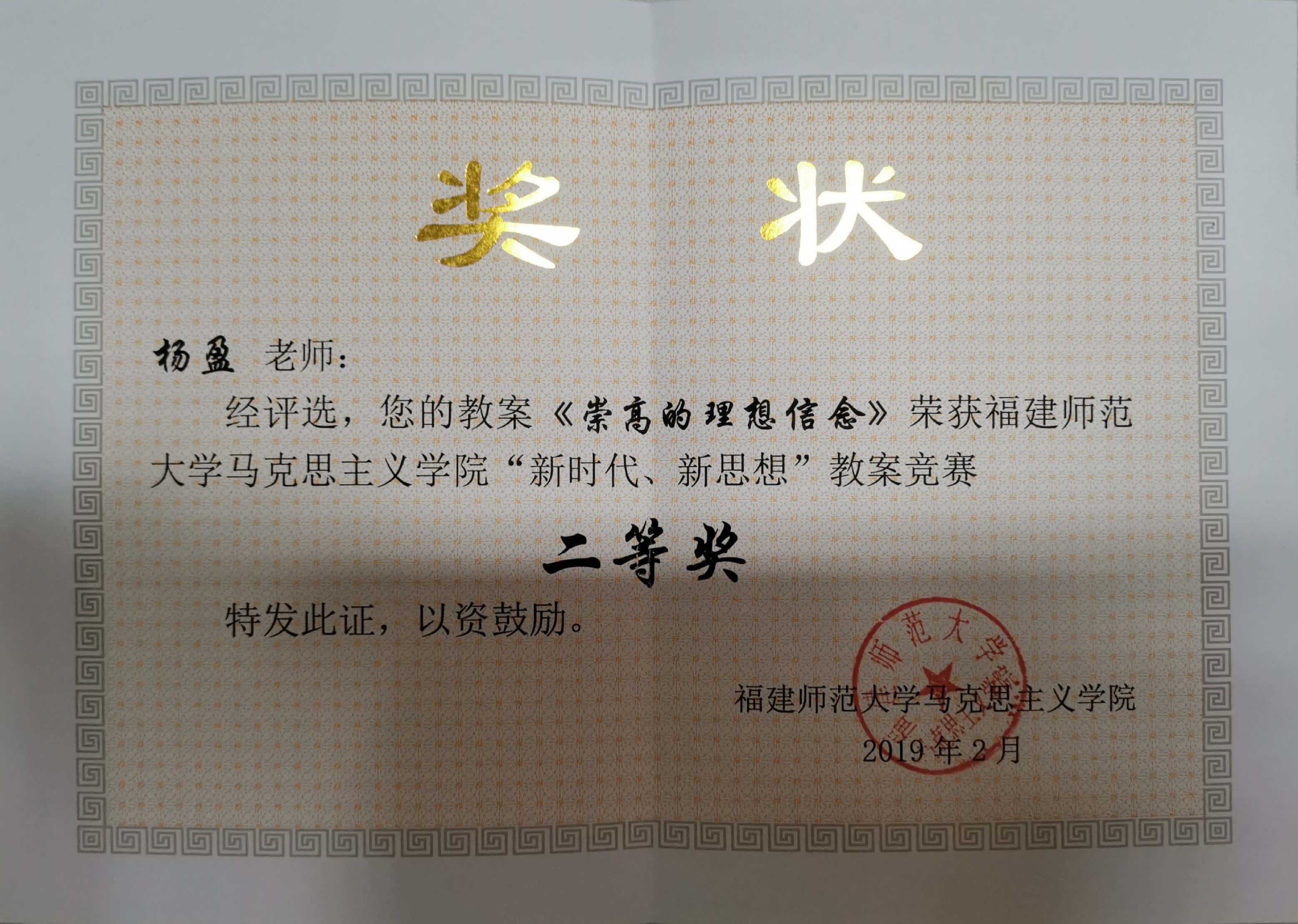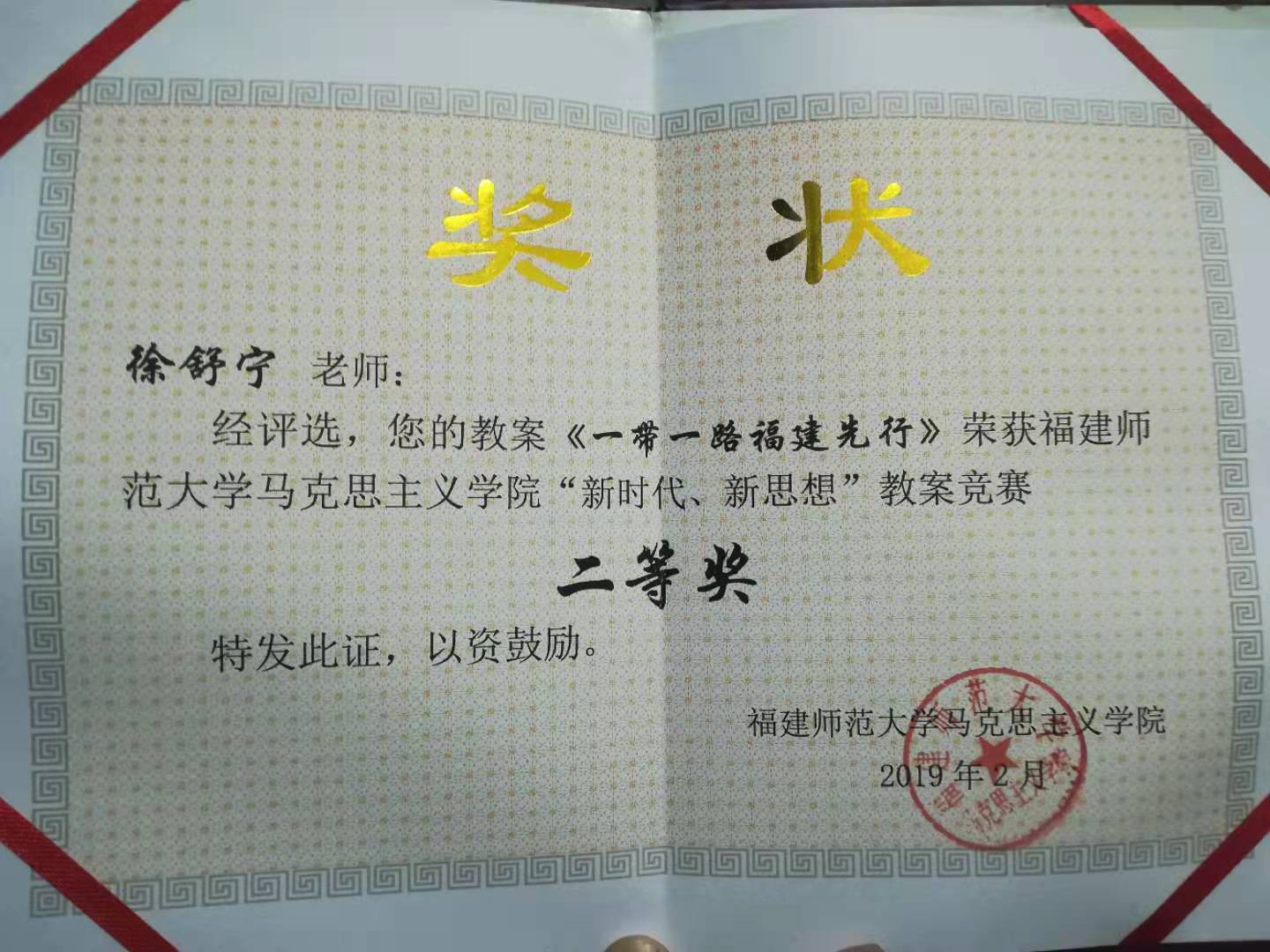 參加此次競(jìng)賽共有4位教師,遞交參賽作品5份,涵蓋《思想道德修養(yǎng)與法律基礎(chǔ)》、《毛澤東思想與中國(guó)特色社會(huì)主義理論體系概論》兩門(mén)課程。其中丁愛(ài)芝老師的《崇高的理想信仰》榮獲一等獎(jiǎng),楊盈老師的《崇高的理想信仰》榮獲二等獎(jiǎng),徐舒寧老師的《一帶一路,福建先行》榮獲二等獎(jiǎng)。