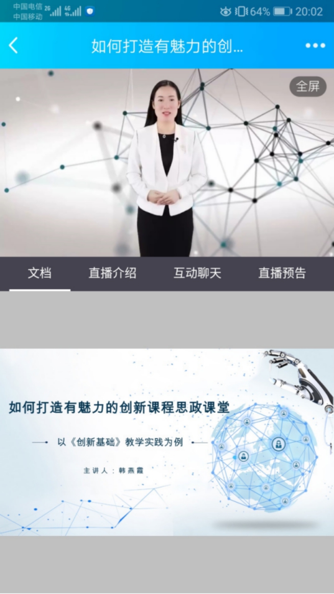韓燕霞老師從創(chuàng)新青年說(shuō)開(kāi)啟了創(chuàng)新之旅,她對(duì)創(chuàng)新做了一個(gè)詳細(xì)的解讀,特別是強(qiáng)調(diào)了創(chuàng)新要作為人才適應(yīng)社會(huì)發(fā)展的第一資源。在講座中,韓老師多次強(qiáng)調(diào)課程思政的重要性,她認(rèn)為作為就業(yè)指導(dǎo)課程的教師,要在授課中融入課程思政的教育,所謂的課程思政其實(shí)質(zhì)不是在高校中增設(shè)一門課程,也不是增設(shè)一項(xiàng)活動(dòng),而是將思想政治教育融入課程教學(xué)和改革的各個(gè)環(huán)節(jié)、各個(gè)方面、才能真正的實(shí)現(xiàn)立德樹人潤(rùn)物無(wú)聲。通過(guò)本次的公益直播講座,全體觀看的教師對(duì)于本學(xué)期開(kāi)設(shè)的創(chuàng)新創(chuàng)業(yè)課程有了進(jìn)一步的認(rèn)識(shí),特別是在授課中融入到課程思政的教學(xué)元素,讓學(xué)生在求職創(chuàng)業(yè)的過(guò)程中能夠更加明確自我的認(rèn)知能力和價(jià)值觀。
