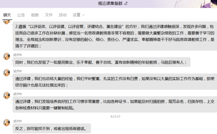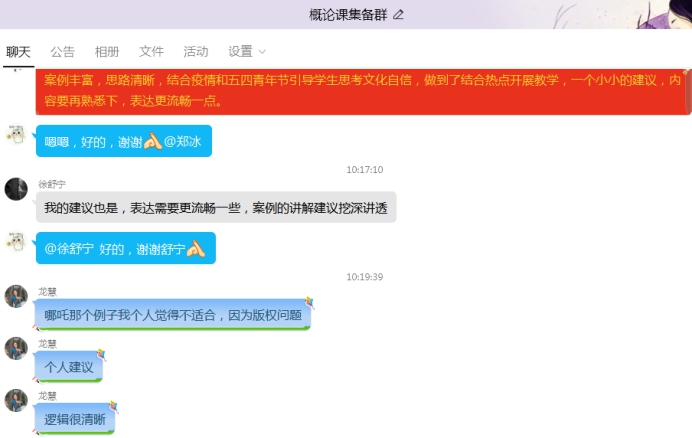 會(huì)上,大家還認(rèn)真聽取邱萍老師關(guān)于《堅(jiān)定文化自信,建設(shè)社會(huì)主義文化強(qiáng)國(guó)》公開課的教學(xué)設(shè)計(jì)和主要內(nèi)容匯報(bào)。經(jīng)討論,廣泛征求意見(jiàn),任課教師普遍認(rèn)為該公開課案例豐富,思路清晰,能夠結(jié)合疫情和五四青年節(jié)引導(dǎo)學(xué)生思考文化自信,做到了結(jié)合熱點(diǎn)開展教學(xué),富有先進(jìn)性和創(chuàng)新性,并提出注意把握時(shí)間、表達(dá)需更流暢等建議,胡濟(jì)林主任提出六點(diǎn)詳盡有益的指導(dǎo)意見(jiàn)。