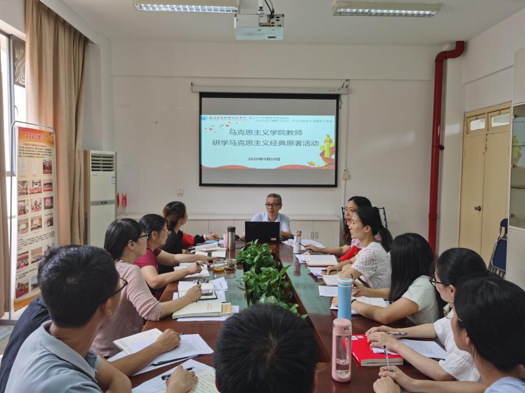2020年9月10日上午,馬克思主義學(xué)院全體思政教師在會議室舉行了第一次馬克思主義經(jīng)典原著研學(xué)活動,此次活動由馬克思主義學(xué)院院長熊美蘭主持,概論教研室主任胡濟林主講。