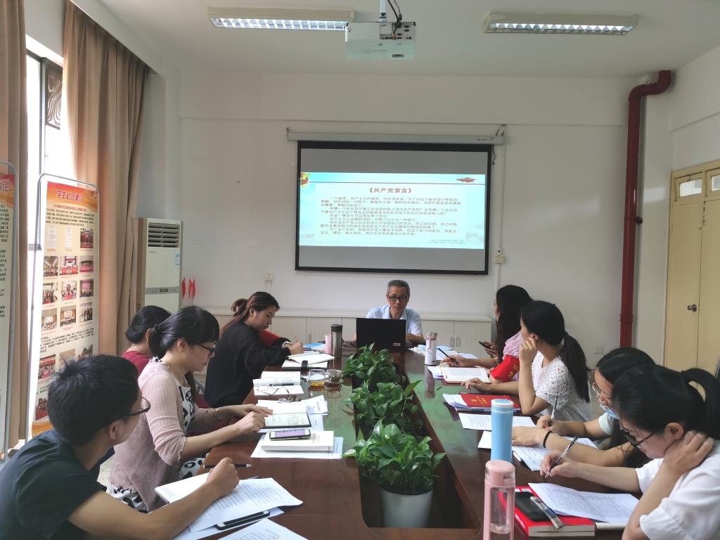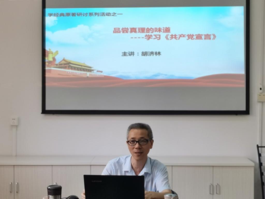 活動中,胡濟林老師首先闡述了自己為什么選擇《共產(chǎn)黨宣言》進(jìn)行研讀,他指出,《共產(chǎn)黨宣言》是國際共產(chǎn)主義運動的第一個綱領(lǐng)性文件,第一次比較系統(tǒng)地闡明了馬克思主義的基本理論;接著,他帶領(lǐng)大家一起學(xué)習(xí)、研討《共產(chǎn)黨宣言》;最后,他為我們分享了他的學(xué)習(xí)體會。他說到,在日常的教育教學(xué)中,我們要堅持實事求是、求真求實的科學(xué)態(tài)度,保持與時俱進(jìn)的觀點,加強教師之間的團結(jié)合作,造就一支政治強、業(yè)務(wù)精的思政教師隊伍。
