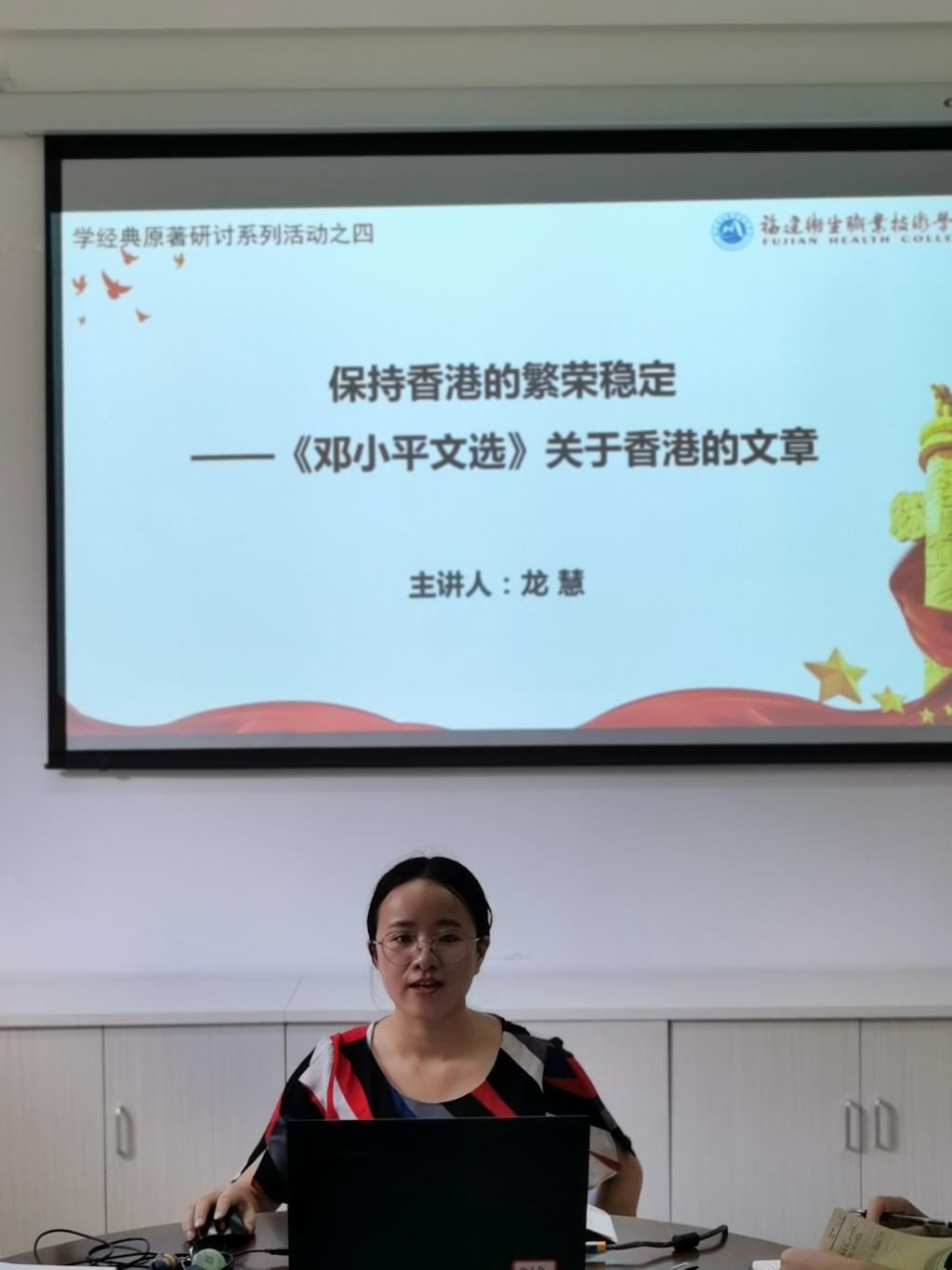 活動(dòng)中,龍慧老師首先闡述了自己為什么選擇《鄧小平文選》關(guān)于香港問(wèn)題文章進(jìn)行研讀,她談到,暑假期間重溫了《鄧小平文選》,更加深刻體會(huì)到鄧小平同志關(guān)于香港問(wèn)題的重要講話的前瞻性。接著,她帶領(lǐng)大家一起學(xué)習(xí)、研討《鄧小平文選》中鄧小平同志關(guān)于香港問(wèn)題的主要觀點(diǎn);最后,她為我們分享了她的學(xué)習(xí)體會(huì)。她說(shuō)道,重溫經(jīng)典,能夠不斷提高自身的政治覺悟,只有理論上清醒,才能保持政治上的堅(jiān)定。