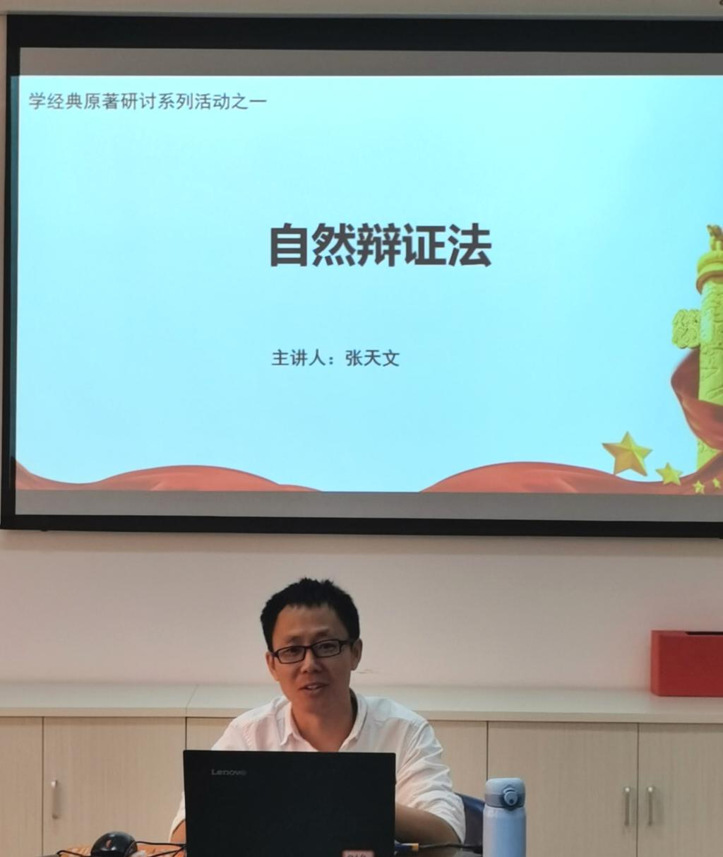 活動中,張?zhí)煳睦蠋熓紫日劦?,恩格斯的《自然辯證法》是唯物辯證法的發(fā)展史上的一個重要的里程碑,在馬克思主義的發(fā)展史上有著特殊的地位。接著,他從該著作的背景、理論地位、主要內(nèi)容和觀點以及該著作的影響和當(dāng)代價值等方面進行研讀。最后,他結(jié)合習(xí)近平總書記系列重要講話精神,闡述習(xí)近平總書記是如何善于把辯證思維用于治國理政實踐中。