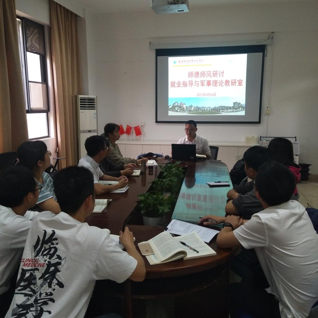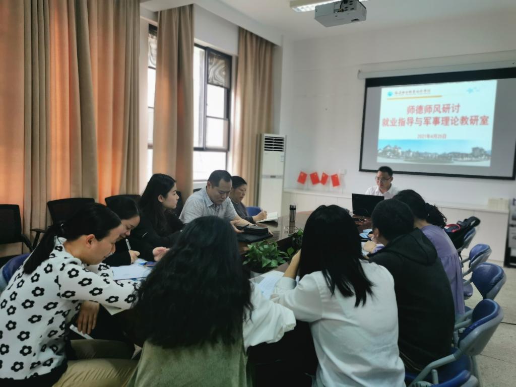 為深入貫徹黨的十九大精神,全面加強教師隊伍師德師風(fēng)建設(shè),同時更好貫徹落實馬克思主義學(xué)院關(guān)于師德師風(fēng)建設(shè)會議精神,2021年4月26日,就業(yè)指導(dǎo)與軍事理論教研室在馬院會議室開展“樹師德正師風(fēng)”師德師風(fēng)研討交流活動。
