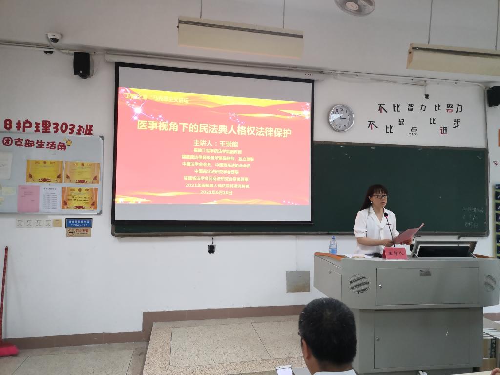 為深入貫徹落實(shí)習(xí)近平法治思想和中央全面依法治國(guó)工作會(huì)議精神,落實(shí)教育部黨組推進(jìn)習(xí)近平法治思想進(jìn)教材、進(jìn)課堂、進(jìn)頭腦工作部署,切實(shí)將習(xí)近平法治思想納入高校法治理論教學(xué)體系,提高思想政治理論課教師和我校學(xué)生法治素養(yǎng),特別邀請(qǐng)福建工程學(xué)院法學(xué)院副教授、福建建達(dá)律師事務(wù)所高級(jí)律師王崇能于2021年6月10日來(lái)我校開(kāi)展《醫(yī)事視角下的民法典人格權(quán)法律保護(hù)》的專題講座。講座由我校馬克思主義學(xué)院院長(zhǎng)熊美蘭主持,百余名師生參與講座。