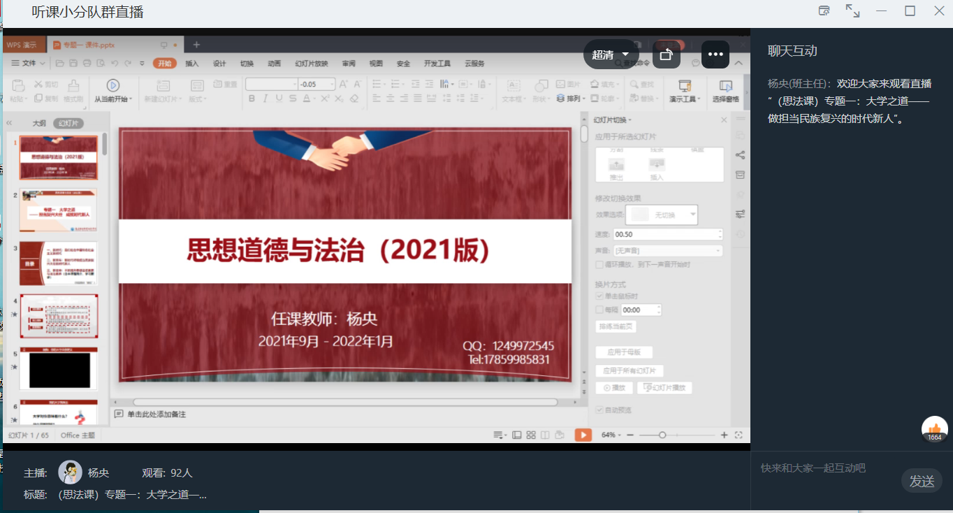 為進(jìn)一步理解2021版《思想道德與法治》新教材,加快課程建設(shè),提升教學(xué)質(zhì)量,使新教師盡快適應(yīng)教學(xué),并遵循科學(xué)防疫的要求?;A(chǔ)教研室于2021年9月17日下午通過釘釘在線教學(xué)平臺(tái)對(duì)新進(jìn)教師楊央老師開展了集中聽課活動(dòng),授課對(duì)象是21級(jí)護(hù)理317、318班,授課內(nèi)容是專題一:大學(xué)之道——做擔(dān)當(dāng)民族復(fù)興大任的時(shí)代新人。參與聽課的教師有馬克思主義學(xué)院院長(zhǎng)熊美蘭,基礎(chǔ)教研室主任顏冰鳳,馬克思主義學(xué)院教師陳洪月、江洪、羅蕓等。