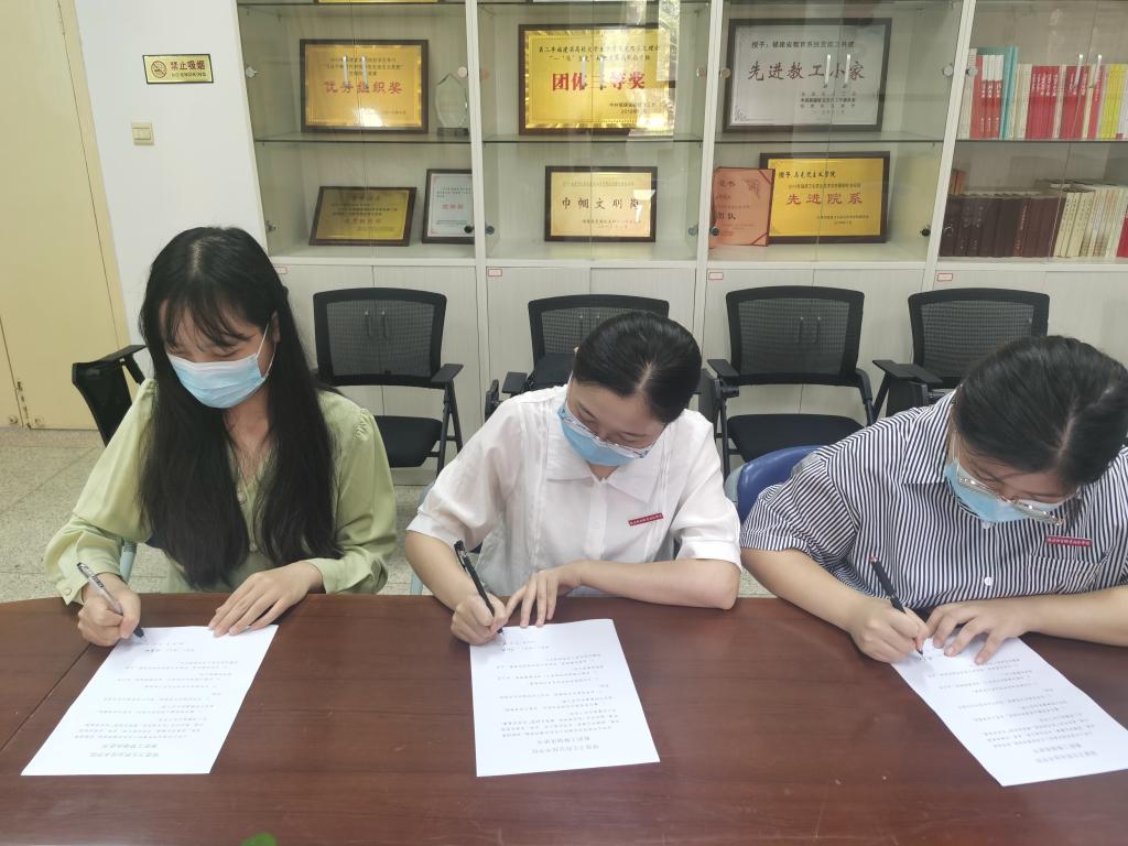 新進(jìn)教職工張晨琳、楊央、曾美玲三位老師表示要積極參與控?zé)熁顒樱步ㄎ拿?、潔凈、?yōu)美的校園環(huán)境,簽訂了《福建衛(wèi)生職業(yè)技術(shù)學(xué)院教職工禁煙承諾書》。