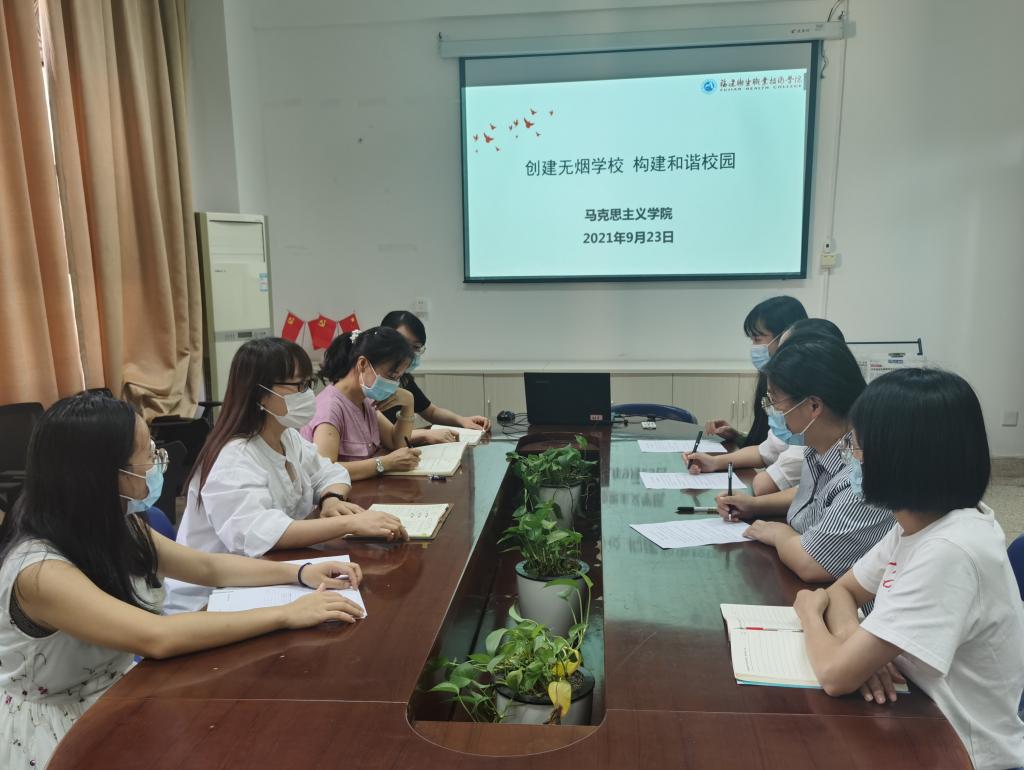 為加強(qiáng)教職工健康知識教育和控?zé)熭浾撔麄鳎M(jìn)一步提高對吸煙危害的認(rèn)識,積極主動參與控?zé)?、戒煙活動,努力營造無煙、清潔、健康、和諧的校園環(huán)境。2021年9月23日下午,馬克思主義學(xué)院全體教職工在107會議室開展禁煙學(xué)習(xí)宣傳活動。