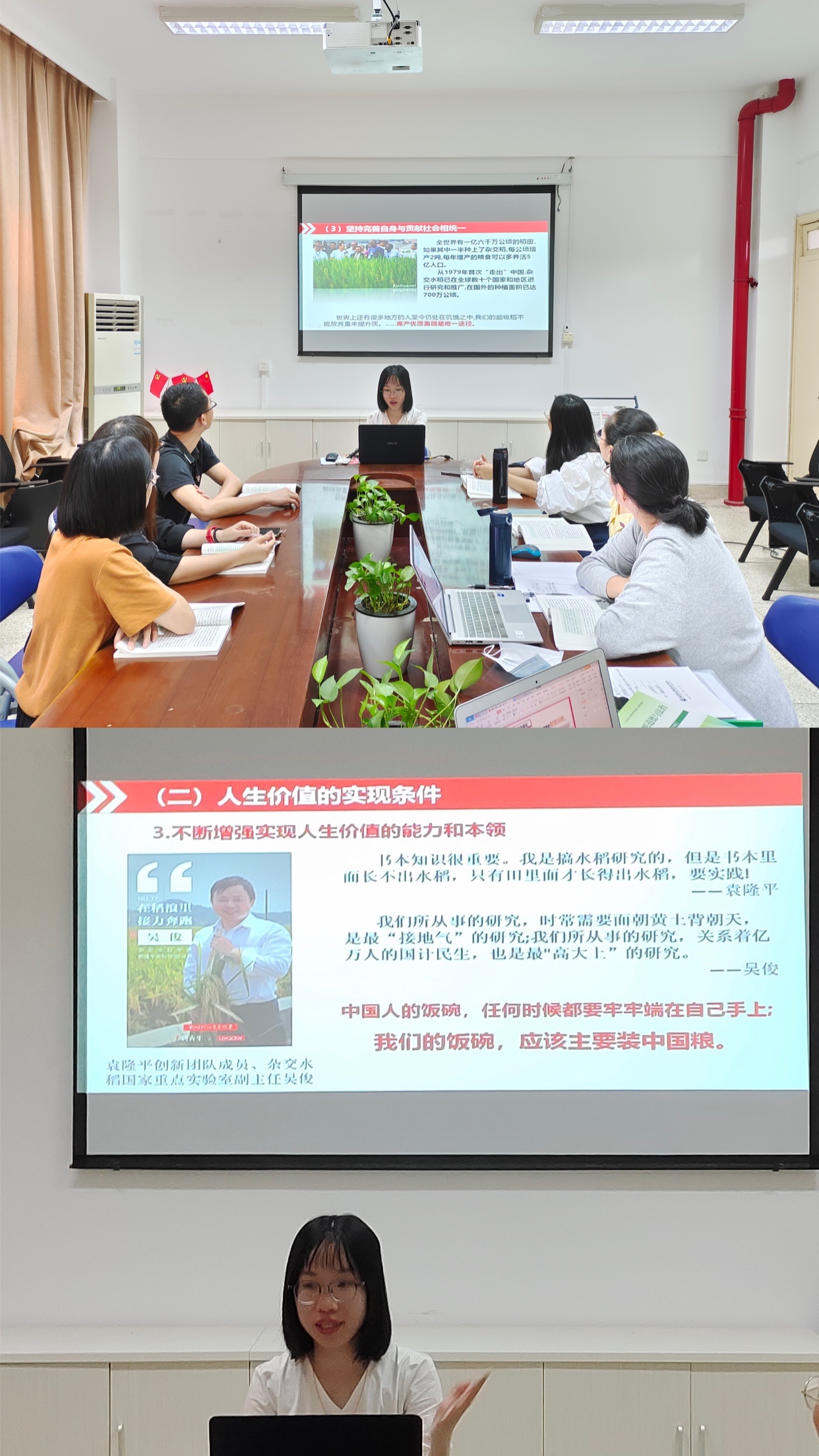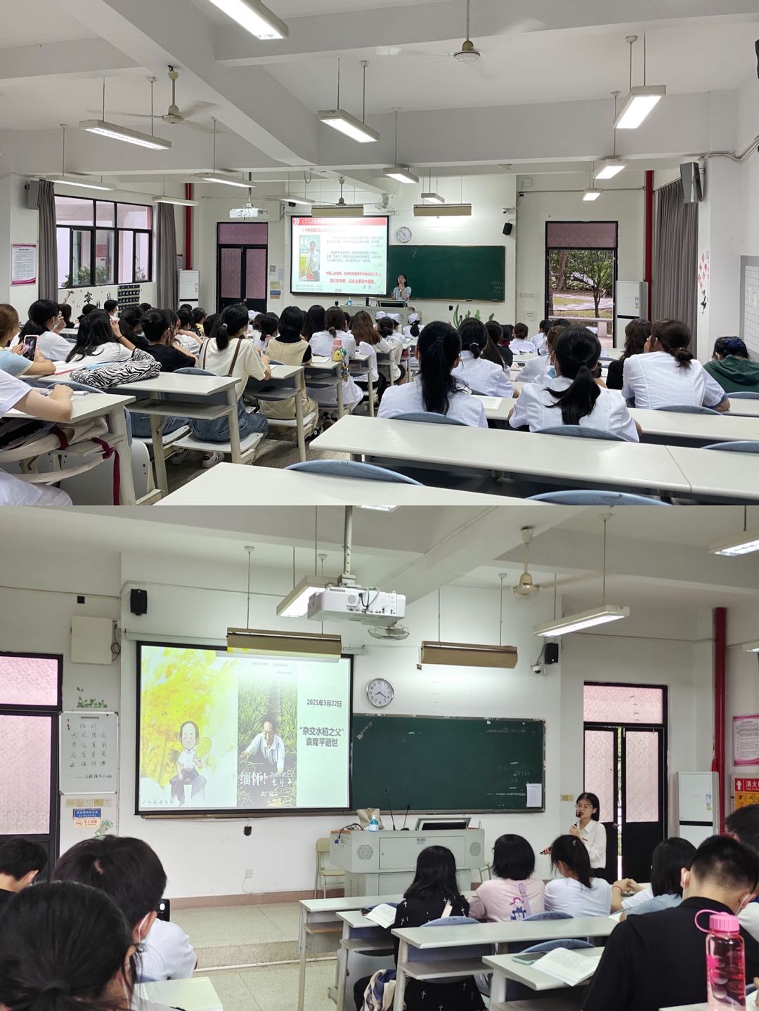 課堂上,任課教師向?qū)W生介紹袁隆平院士的事跡。袁隆平將讓“所有人遠(yuǎn)離饑餓”作為畢生追求。同時(shí),課堂結(jié)合袁隆平“禾下乘涼夢、雜交水稻覆蓋全球夢”,引導(dǎo)學(xué)生“中國人的飯碗,要牢牢掌握到自己手上去”,同學(xué)們深受袁隆平事跡的感動(dòng)。通過此次教學(xué)引導(dǎo),學(xué)生深刻認(rèn)識(shí)糧食來之不易以及糧食安全的重要性。課堂上,任教老師還講授了生態(tài)文明、綠色發(fā)展理念的相關(guān)知識(shí),引導(dǎo)學(xué)生認(rèn)識(shí)和理解綠色發(fā)展,爭做具有生態(tài)文明價(jià)值觀的醫(yī)藥衛(wèi)生人才。