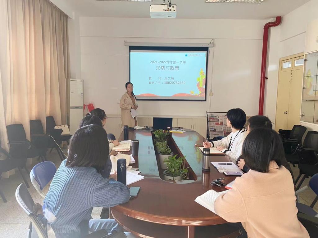為全面提升教師教學質量,加快課程建設,規(guī)范和提升教學質量,嚴格執(zhí)行兼課教師準入制度,把好兼課教師入門關,2021年12月7日下午,馬克思主義學院形勢與政策教研室在行政樓107會議室開展兼課教師吳文娟試講活動,吳文娟授課內容是《奮斗百年路 啟航新征程》。試講聽課活動由形勢與政策教研室主任鄭冰主持,形勢與政策教研室全體專職教師和部分馬克思主義學院教師參加。