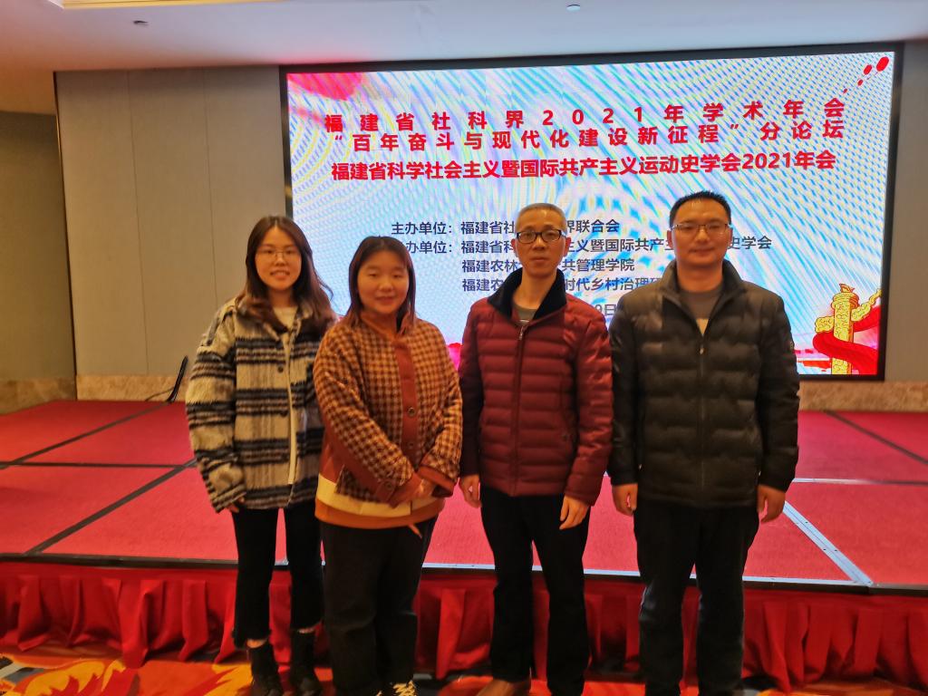 2021年12月18日至19日,由福建省社會(huì)科學(xué)界聯(lián)合會(huì)主辦,福建省科學(xué)社會(huì)主義暨國際共產(chǎn)主義運(yùn)動(dòng)史學(xué)會(huì)、福建農(nóng)林大學(xué)公共管理學(xué)院、福建省社科研究基地新時(shí)代鄉(xiāng)村治理研究中心聯(lián)合承辦的2021年福建省社科界學(xué)術(shù)年會(huì)“百年奮斗與現(xiàn)代化建設(shè)新征程”分論壇暨福建省科學(xué)社會(huì)主義暨國際共產(chǎn)主義運(yùn)動(dòng)史學(xué)會(huì)2021年年會(huì)在福州召開。我校馬克思主義學(xué)院教師胡濟(jì)林、張崇飛、林美辰、朱麗燊等4位出席年會(huì)。