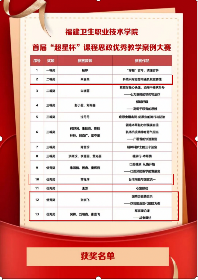 近日,首屆“超星杯”全國職業(yè)院校課程思政優(yōu)秀教學案例大賽公布獲獎名單。馬克思主義學院朱麗燊、張崇飛、蔣程序、劉明鑫、吳鋒幾位教師的參賽作品脫穎而出,分別斬獲二等獎1項、優(yōu)秀獎3項。