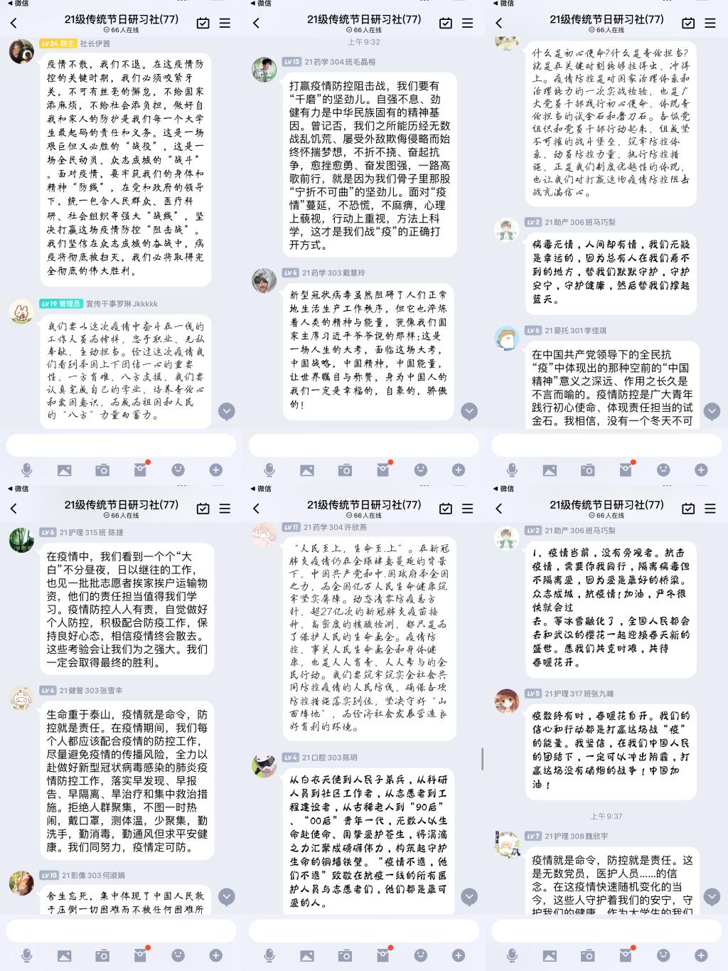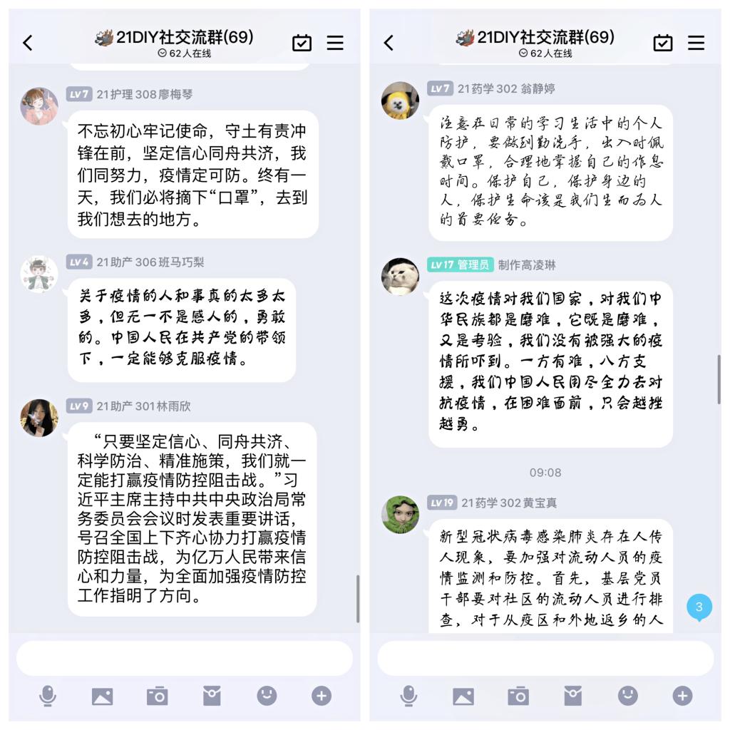 20護(hù)理302黃心瑤:歷史反復(fù)證明,只有人民群眾才是歷史的創(chuàng)造者。要戰(zhàn)勝前進(jìn)道路上的任何艱難險(xiǎn)阻,要實(shí)現(xiàn)中華民族偉大復(fù)興的中國夢,必須始終做到為了群眾、依靠群眾、凝聚群眾、組織群眾。當(dāng)祖國需要我們時(shí),我們應(yīng)該沖向前去時(shí),做出我們的選擇去扛起我們的擔(dān)當(dāng)!我作為一名護(hù)理專業(yè)的大學(xué)生,與在抗疫一線的醫(yī)務(wù)工作者相比,我們能做的并不多,也沒有那么危險(xiǎn),我希望可以用自己的實(shí)際行動(dòng)承擔(dān)起青年的責(zé)任,每人力所能及的作出貢獻(xiàn),疫情終有一天驅(qū)散!