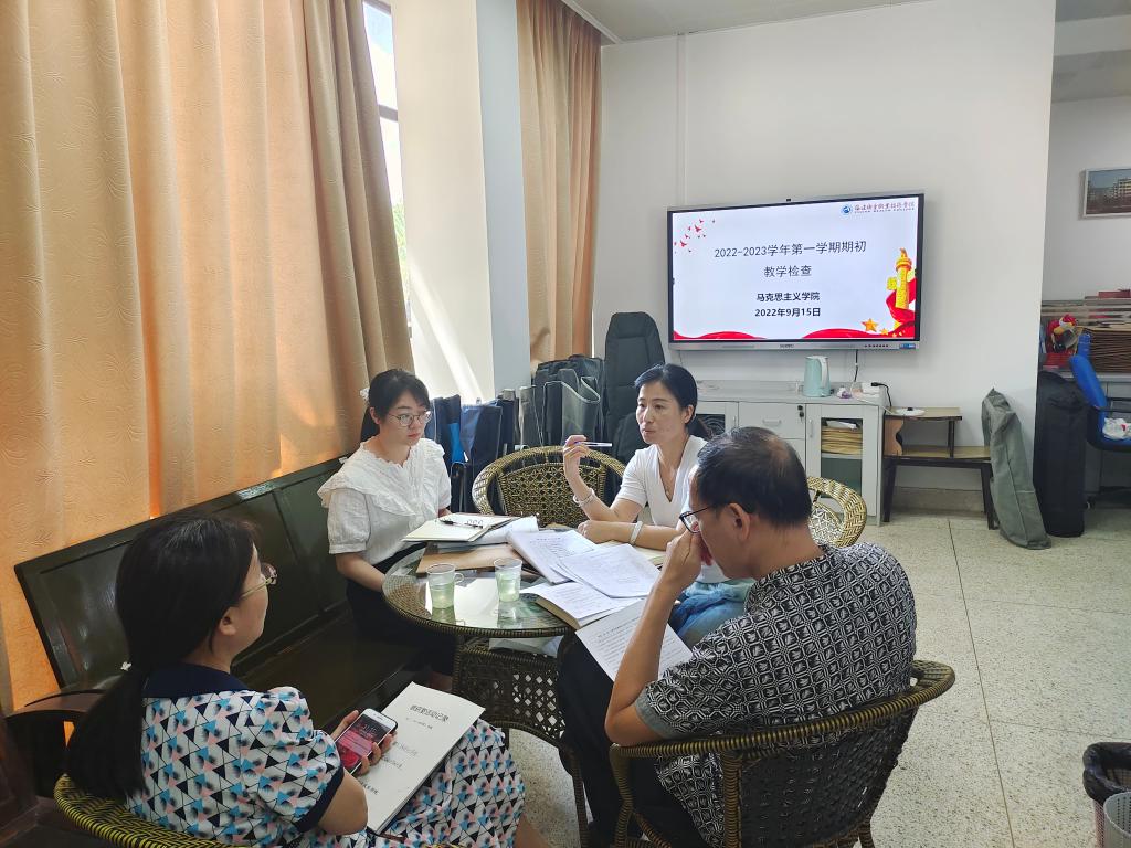 為了維護(hù)教學(xué)秩序,嚴(yán)格教學(xué)規(guī)范,提升教師教學(xué)能力,提高人才培養(yǎng)質(zhì)量,落實(shí)立德樹人的根本任務(wù)。2022年9月16日上午,學(xué)校質(zhì)量管理辦公室郭禮堅(jiān)主任、王珊珊老師、馬院副院長(zhǎng)來(lái)朋珍、吳薇老師參加了這次檢查。