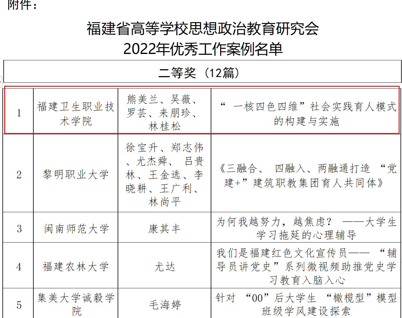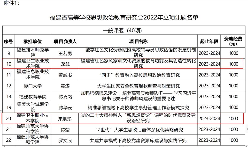 近日,福建省高等學(xué)校思想政治教育研究會(huì)公布了2022年優(yōu)秀工作案例、優(yōu)秀論文評(píng)選結(jié)果和課題立項(xiàng)名單。我校思想政治教育成果再獲佳績(jī),《“一核四色四維”社會(huì)實(shí)踐育人模式的構(gòu)建與實(shí)施》(項(xiàng)目成員:熊美蘭、吳薇、羅蕓、來朋珍、林桂松)榮獲優(yōu)秀工作案例二等獎(jiǎng);論文《讓少數(shù)民族地區(qū)留守女性參與產(chǎn)業(yè)發(fā)展成為中國(guó)式現(xiàn)代化的巾幗引擎》(作者:蔣楠)、《思想政治教育發(fā)生的再探究——基于馬克思主義發(fā)生學(xué)方法》(作者:楊盈)分別榮獲二等獎(jiǎng)、三等獎(jiǎng);課題《福建省紅色家風(fēng)家訓(xùn)文化資源的教育功能及其創(chuàng)造性轉(zhuǎn)化研究》(負(fù)責(zé)人:龍慧)和《黨的二十大精神融入“新思想概論”課程的時(shí)代意蘊(yùn)及建設(shè)路徑研究》(負(fù)責(zé)人:來朋珍)獲得立項(xiàng)。